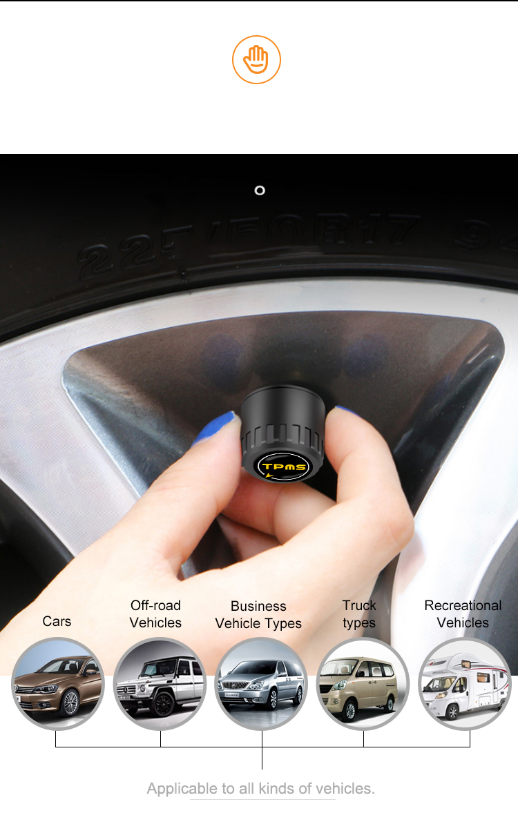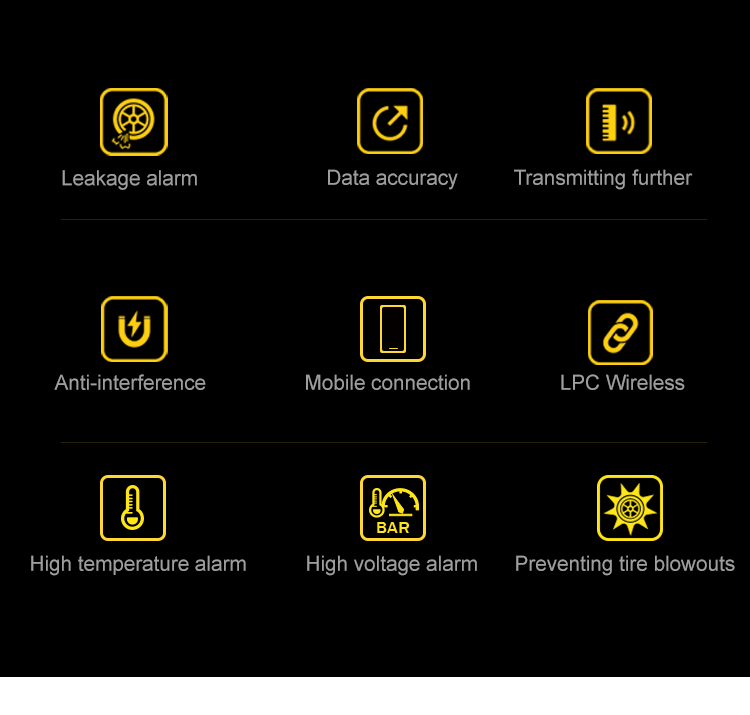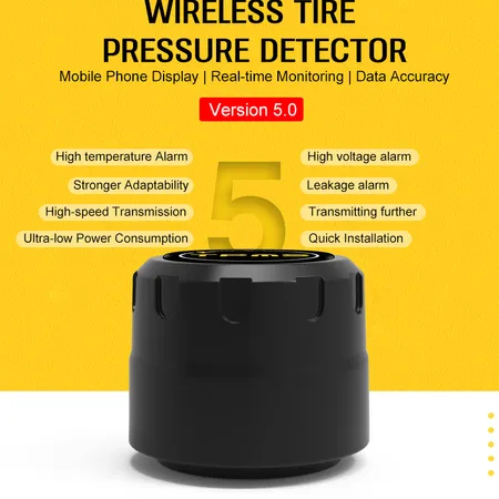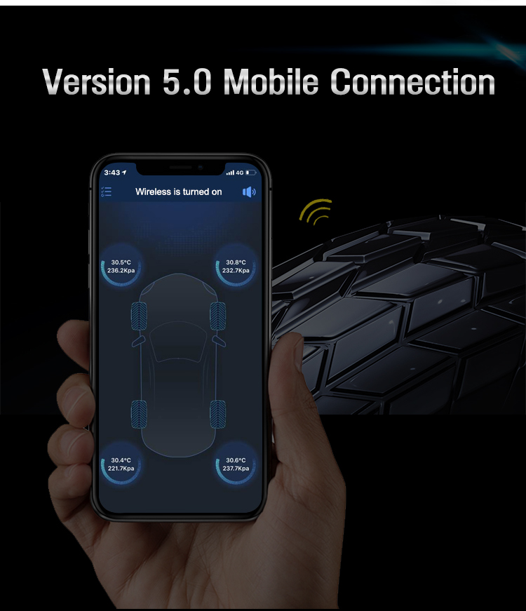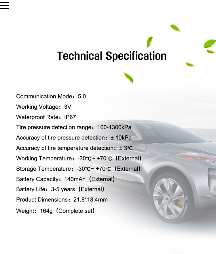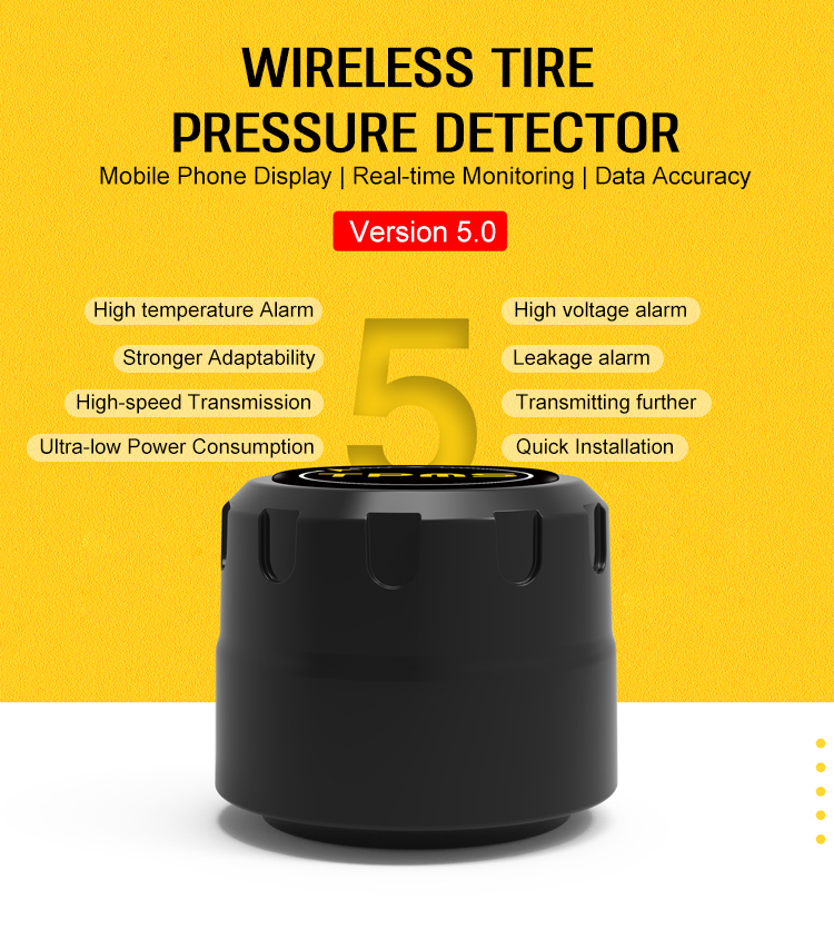This TPMS system supports iOS, Android, iPad, Bluetooth 5.0, Real time monitoring, Tire pressure leak alarm, High tire pressure alarm, Low tire pressure alarm, High temperature and high pressure alarm, App display, Accurate detection data, Stable transmission without packet loss.