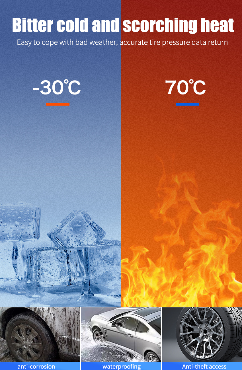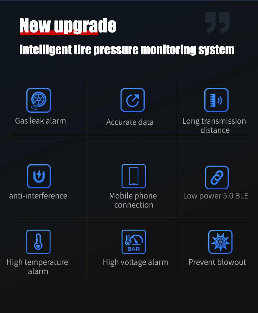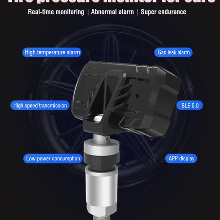 This TPMS system supports iOS, Android, iPad, Bluetooth 5.0/4.0, Real time monitoring, Tire pressure leak alarm, High tire pressure alarm, Low tire pressure alarm, High temperature and high pressure alarm, App display, Accurate detection data, Stable transmission without packet loss.