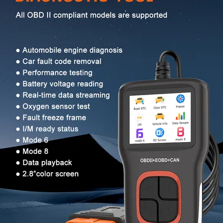 This OBD scanner delivers comprehensive vehicle scanning capabilities: It can perform automobile engine diagnosis and remove car fault codes, while supporting battery voltage monitoring and real-time data streaming. It features oxygen sensor testing, fault freeze frame capture, and I/M readiness status checking. The tool enables advanced Mode 6 and Mode 8 diagnostics, offers data playback functionality, and presents all information through a clear 2.8" color display for optimal visibility.
