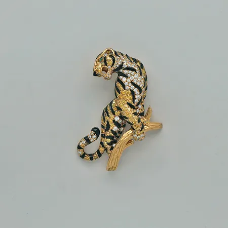 A French made Van Cleef & Arpels tiger brooch made of diamonds, yellow diamonds, and onyx with an emerald eye.