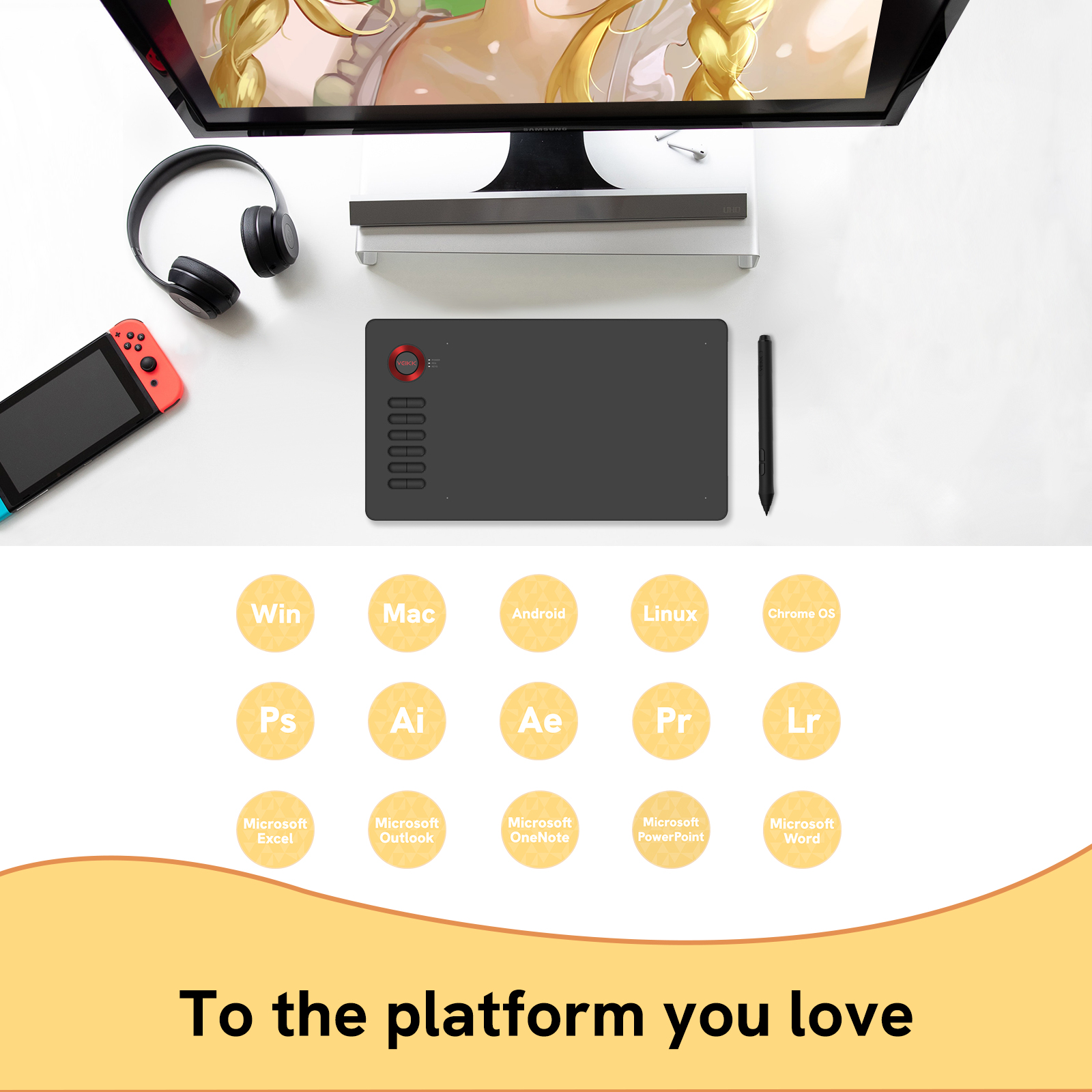 A15 digital drawing tablet supports macOS 10.12 or above, Windows 7 or above, Android 6.0 or above and Linux OS. You can easily connect the mobile phone to this graphic tablet with the OTG connector. It is compatible with most software, such as Adobe Photoshop, Illustrator, Sai, Corel painter, Comic Studio, MediBang Paint, Paintstorm Studio, Clip Studio, Krita, etc.