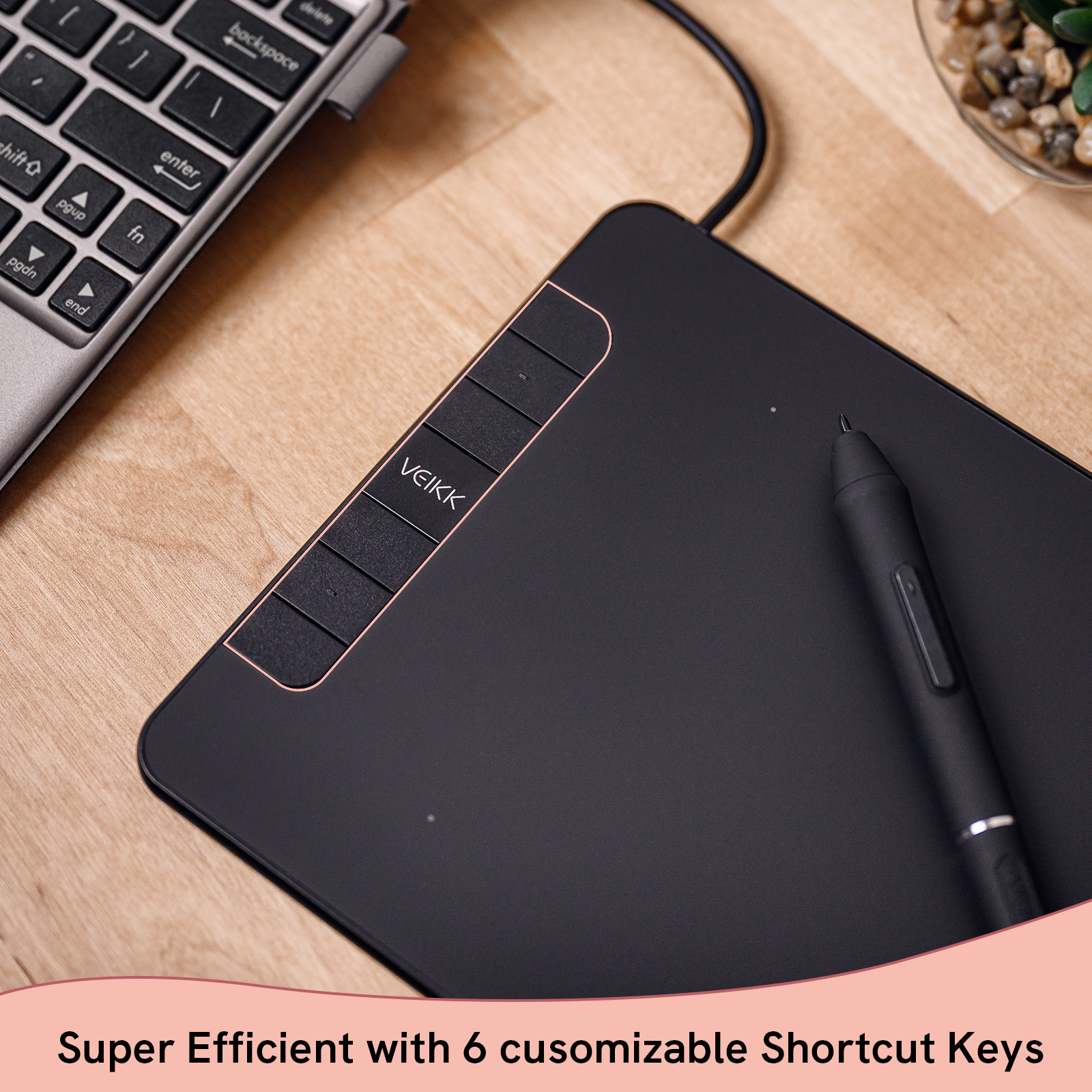 The VK640 comes with 6 comfortable-to-touch custom shortcuts that you can program for your favorite keyboard shortcuts, such as zoom in/out, brush size +/-, undo, etc., to streamline your workflow and increase productivity.