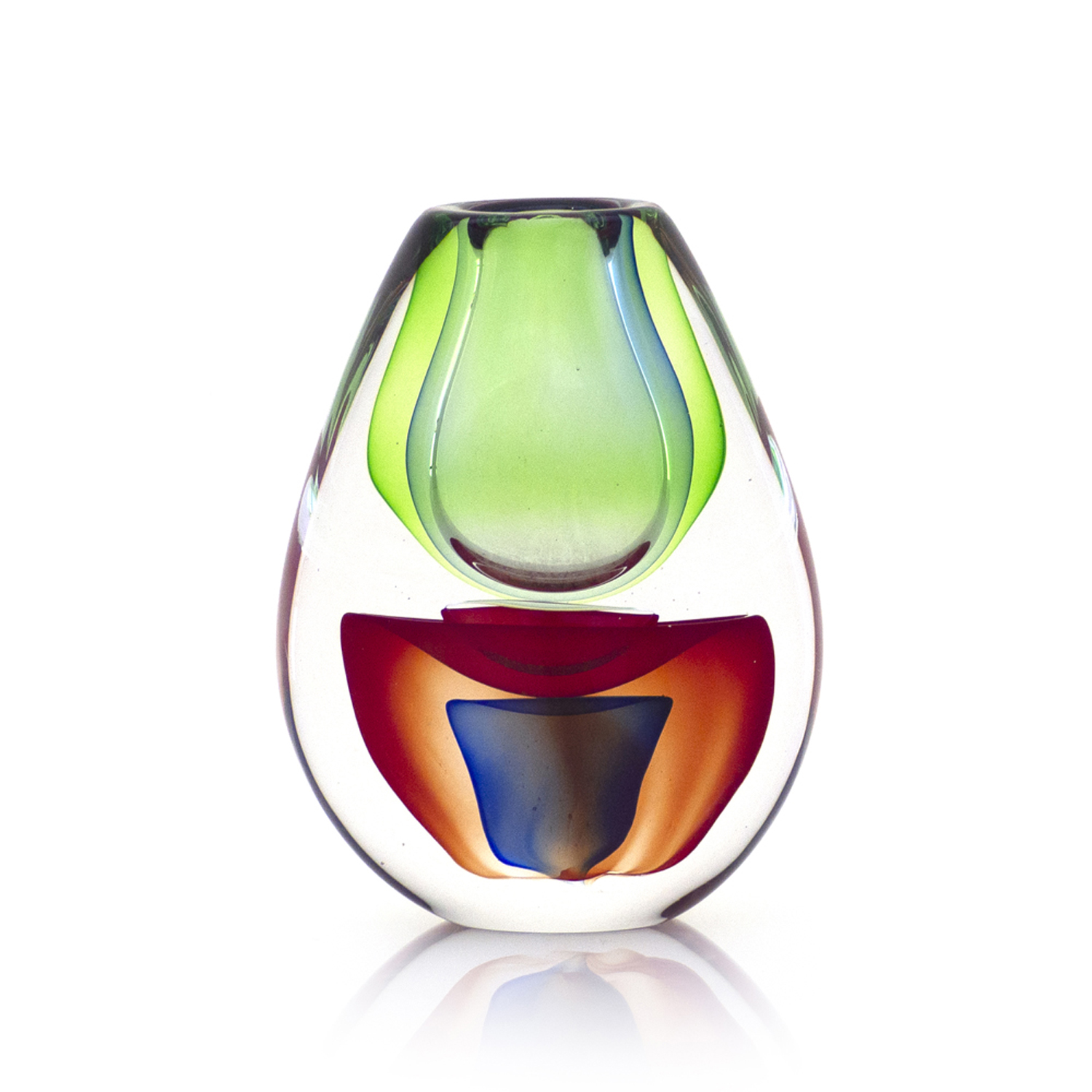 With its rich earthy red, deep ocean blue and airy blue-green hues, Verdant Life radiates a mesmerizing energy. Encased in crystal-clear glass, this stunning showpiece demonstrates the brillance of the material.
