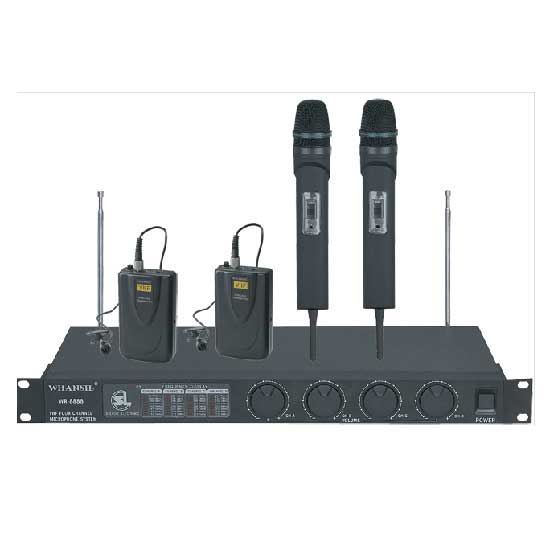 Outlined is a VHF wireless microphone system that comes with a 4-channel design. The excellent high-frequency amplifier works with the advanced antennae to offer high stability. This interference-proof wireless microphone is ideal for household entertainment systems.