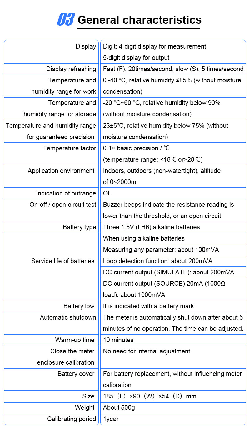 Resistance | Range | N/A | N/A | 0~400.0Ω |