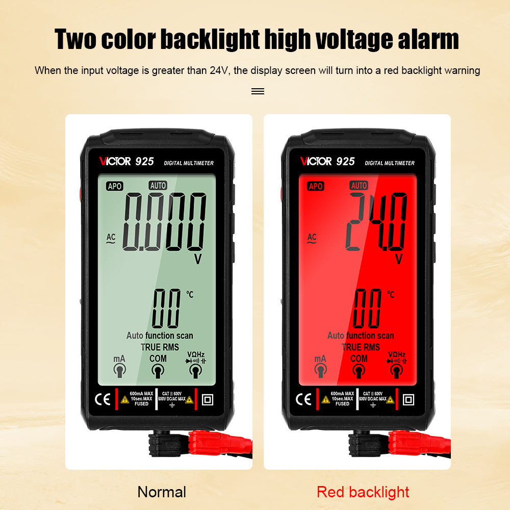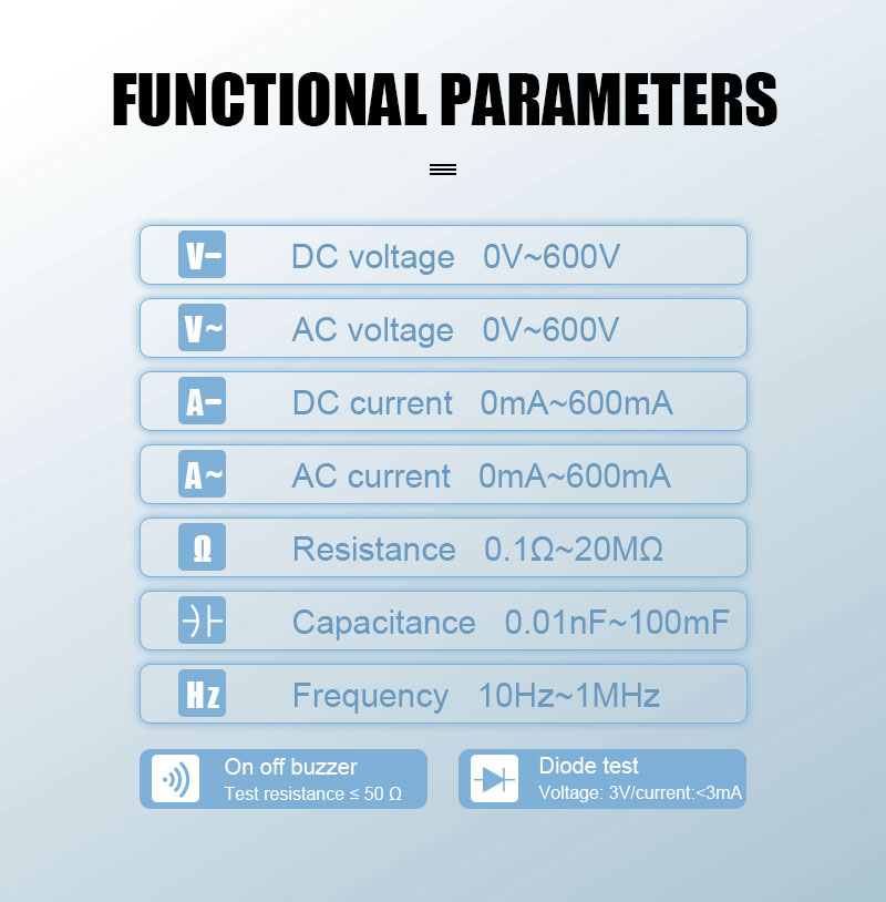 It is an large-screen intelligent multi-purpose meter that can automatically identify functions and ranges according to the input measurement signals, making the operation simpler, more convenient and faster. The product is designed to meet the requirements of safety regulations CAT III 600V, with full functional design overload protection, safe and reliable operation, and innovative patent appearance design and functional configuration logo.