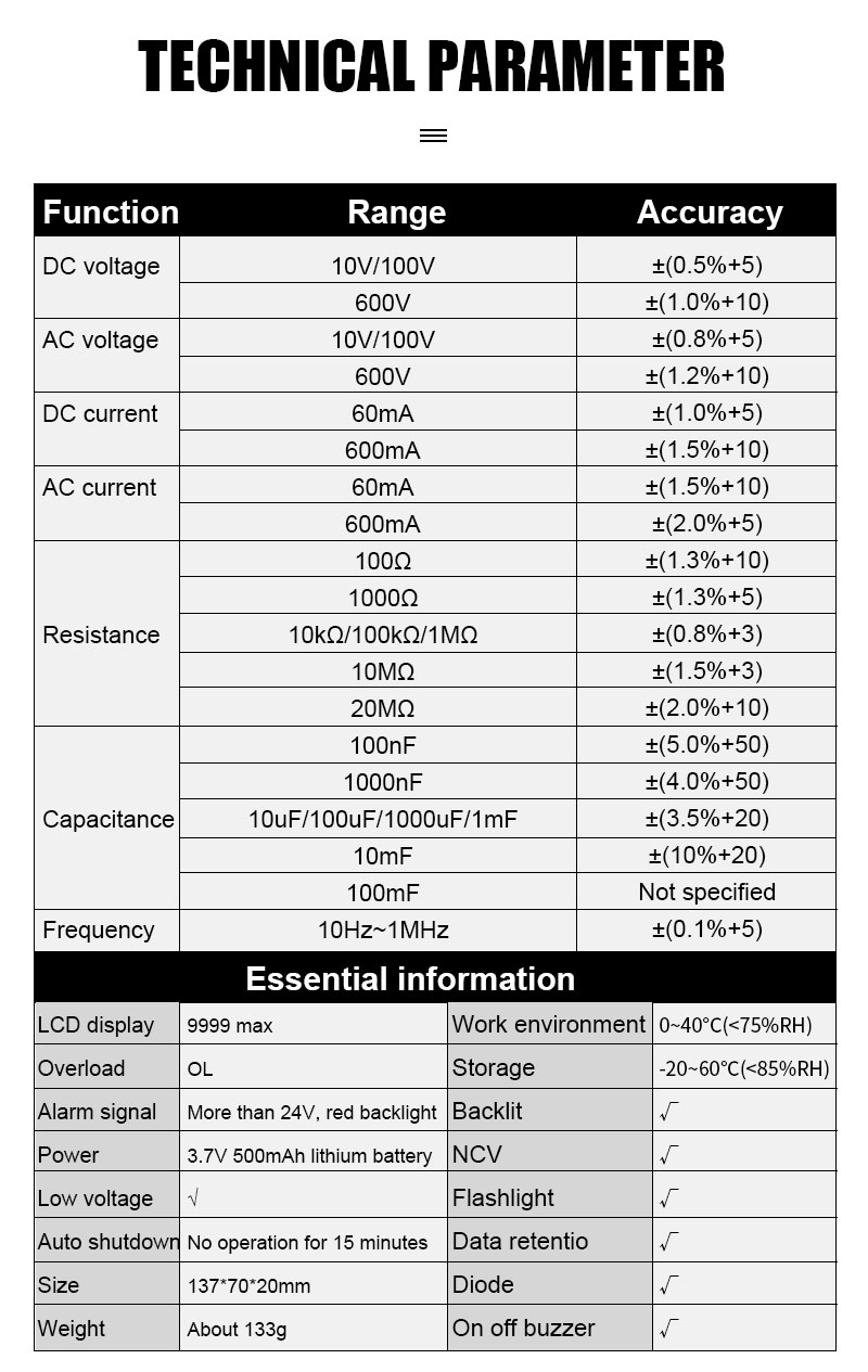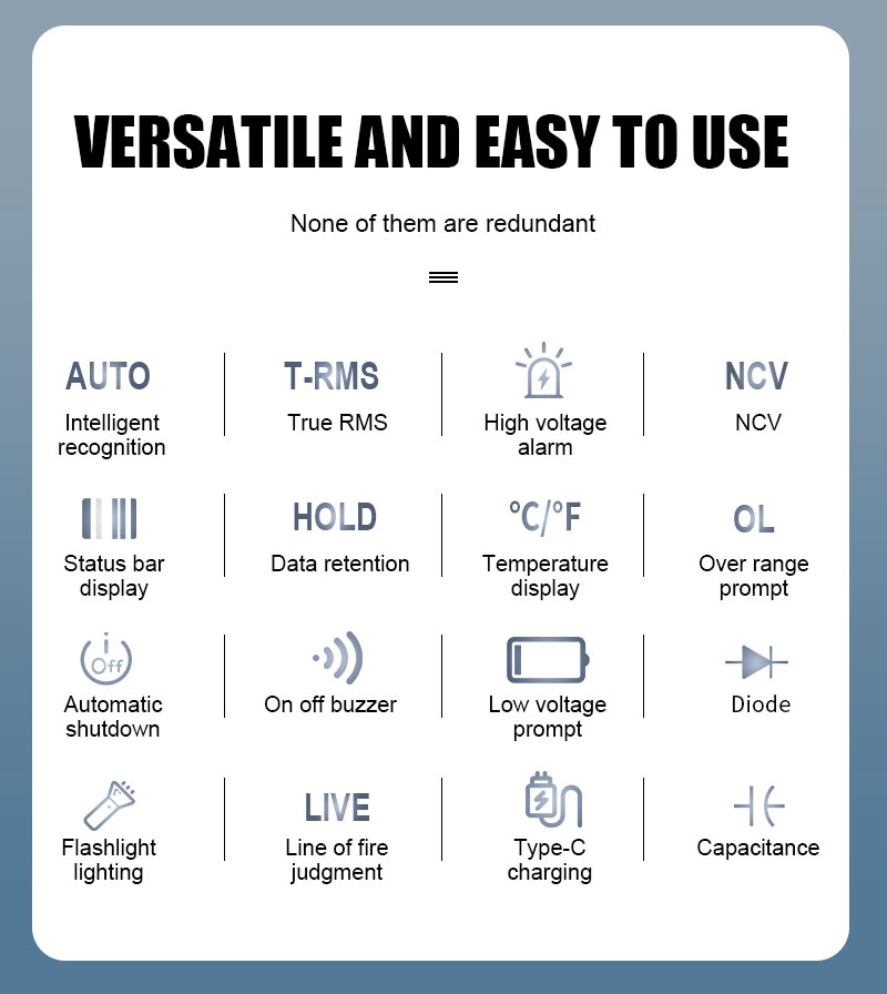It can be used to measure DCV, ACV, DCA, ACA, resistance and continuity test, NCV (non-contact ACV induction measurement), Live(live line judgment) and torch functions. It is the ideal entry level tools of the electronic hobbyists and home users.