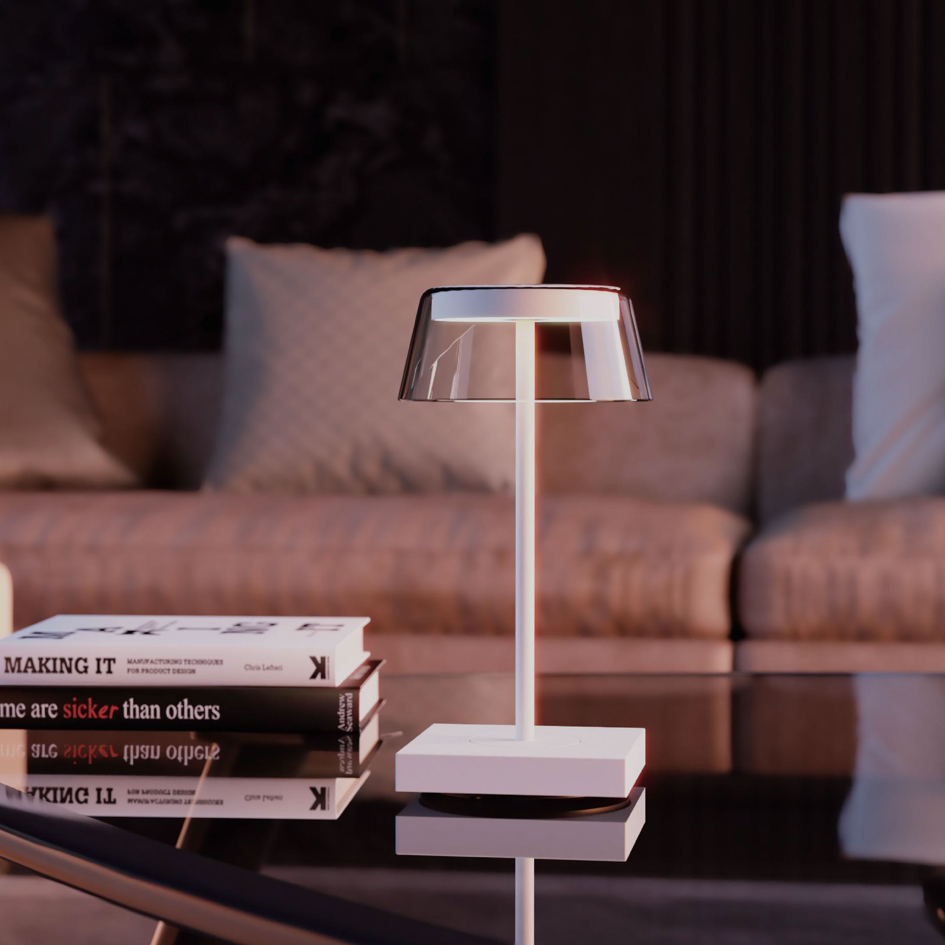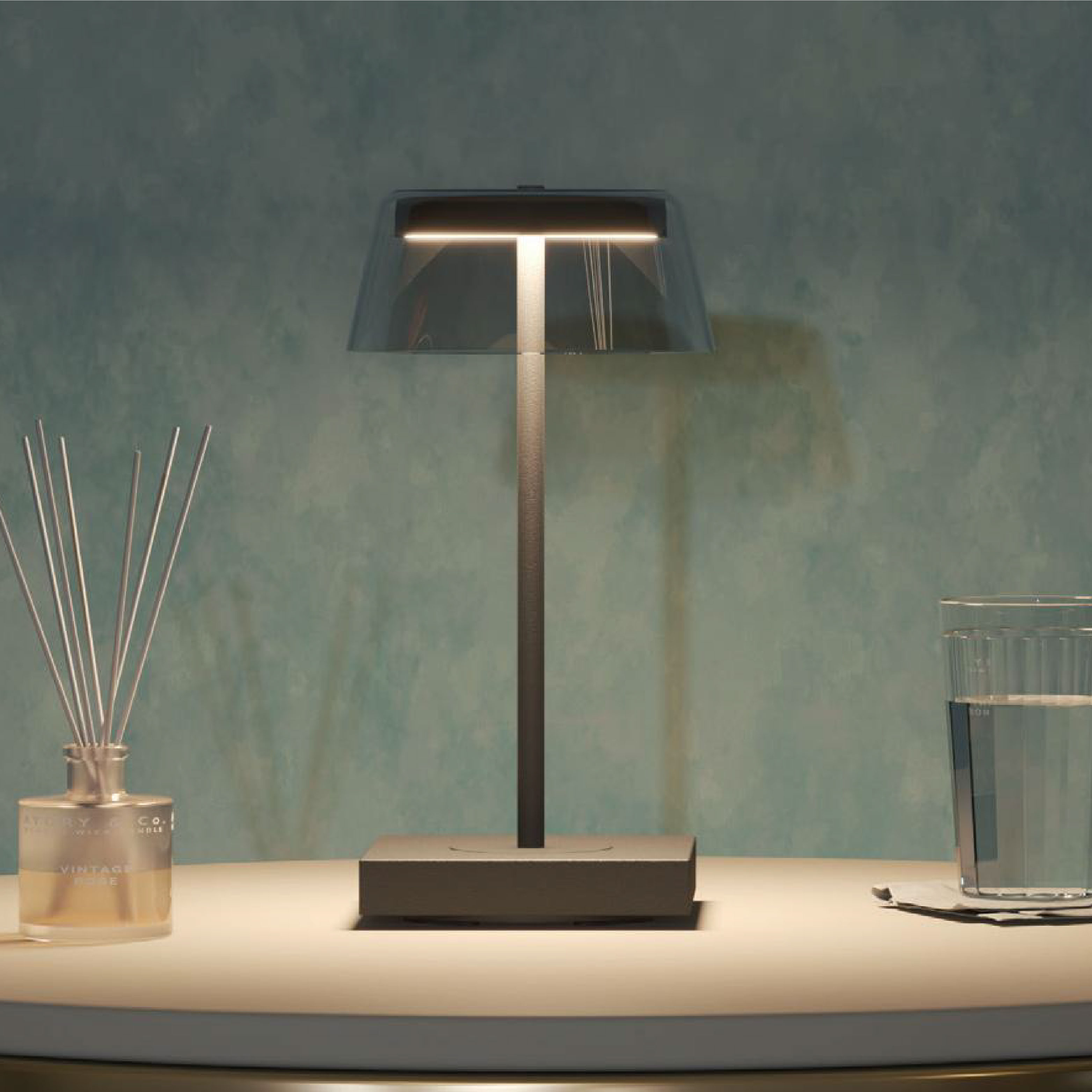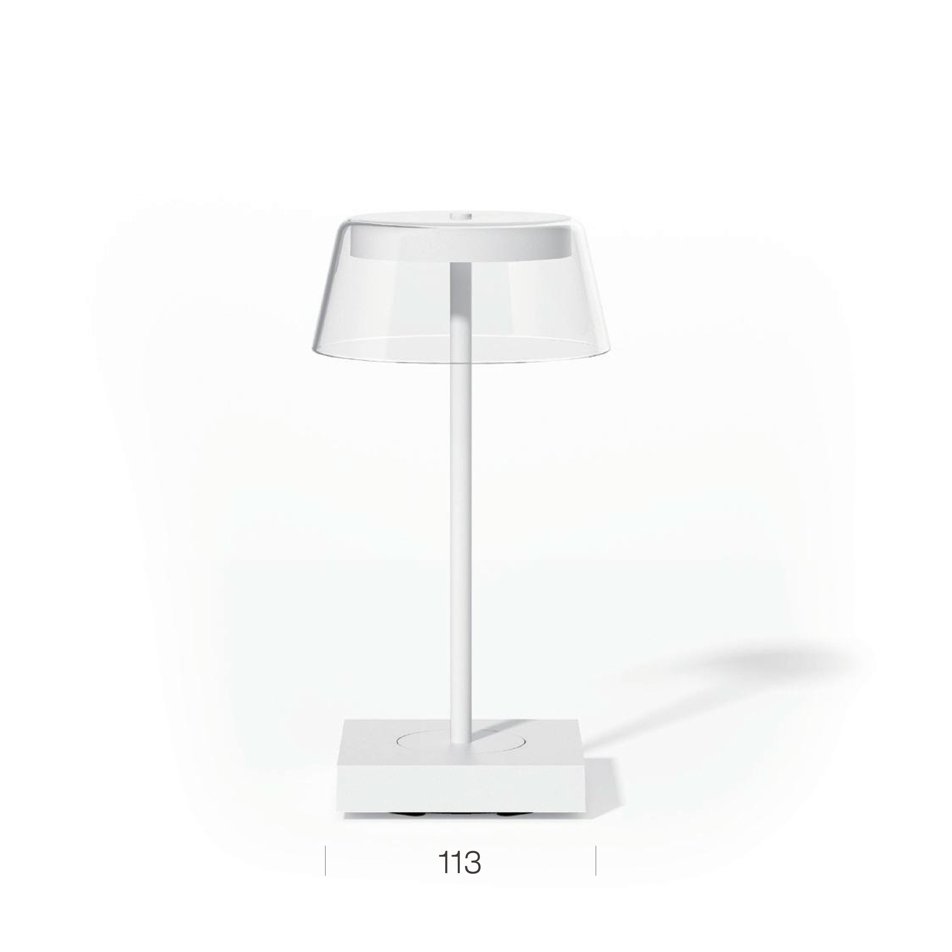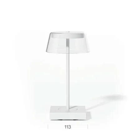 Rechargeable table lamp with a contact charging base.