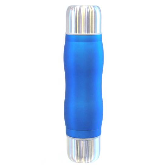 As shown is a vacuum flask which can keep drinks in it hot for a long time due to its double walled insulation design. The two-lid design of this flask prevents leakage well. The streamline flask body allows ones to hold it by hand easily.