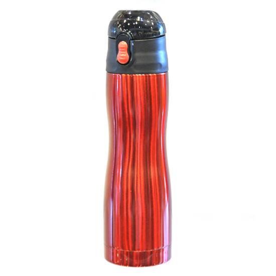 As shown is a vacuum flask which can keep drinks in it hot for a long time due to its double walled insulation design. The streamline body of the flask allows ones to hold the it by hand easily. It is a nice accessory for outdoor activity use.