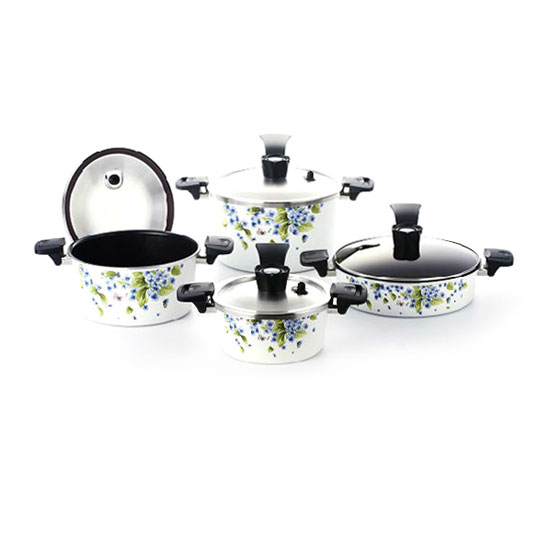 This is a vacuum pot set coming with four pieces of cookware. The items are adorned with delicate decal printing. The cookware is equipped with durable, cool-touch handles for added user safety.