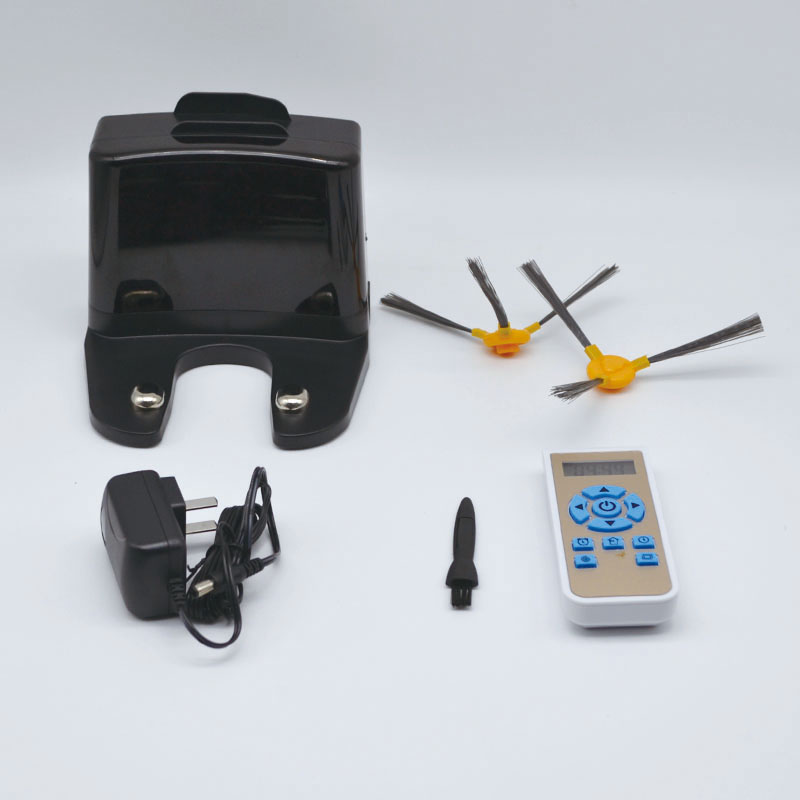 • Accessories List: 1. Robot cleaner(including Li-ion Battery);2.Adaptor; 3. Clean Brush; 4. HEPA filter 2; 5. Side brushes 2; 6. Water tank; 7. Mopping cloth 2; 8. Instruction Manual;