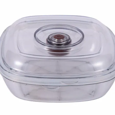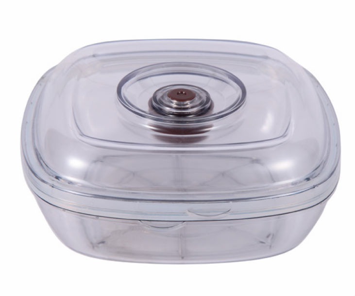 This is a vacuum seal container having a squircle contour and clear construction for viewing items inside. The item helps to keep food fresh and clean by minimizing the chance of contamination or oxidation. Having a perfect size, this item will not take up much storage space at your home.