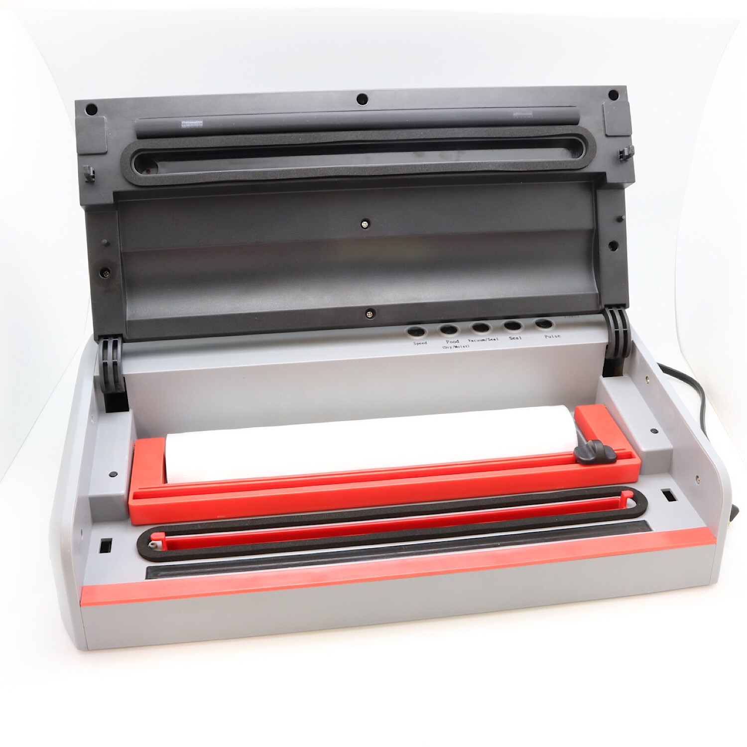 Full size model, Easy lock- latch manual operation, Built-in roll storage and culter, Crush free control helps protect and store delicate foods, Removable easy-clean antibacterial drip. Automatically open& automatically close. Super vacuum sealing system. Super repetative sealing systm