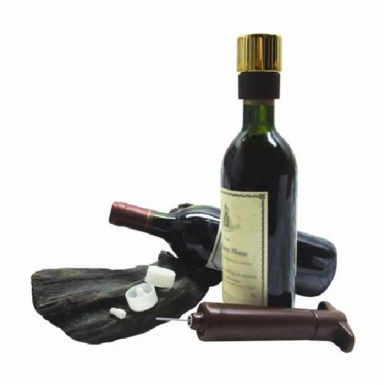 Displayed is a vacuum wine saver that features two wine stoppers. With this wine saver, you can then keep your favorite wine fresh for up to a month. This wine saver helps remove air from the bottle and the sealing cap, preventing oxygen from entering the bottle. This vacuum wine saver is a perfect item to keep your wine in a good condition.