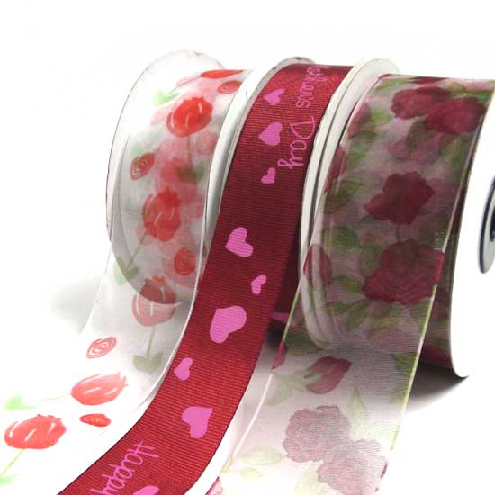 These elegant Valentine-themed ribbons are accented with vivid heart or rose printing. The quality ribbons boast excellent strength and durability. The ribbons come with solid or translucent colors for your selection.