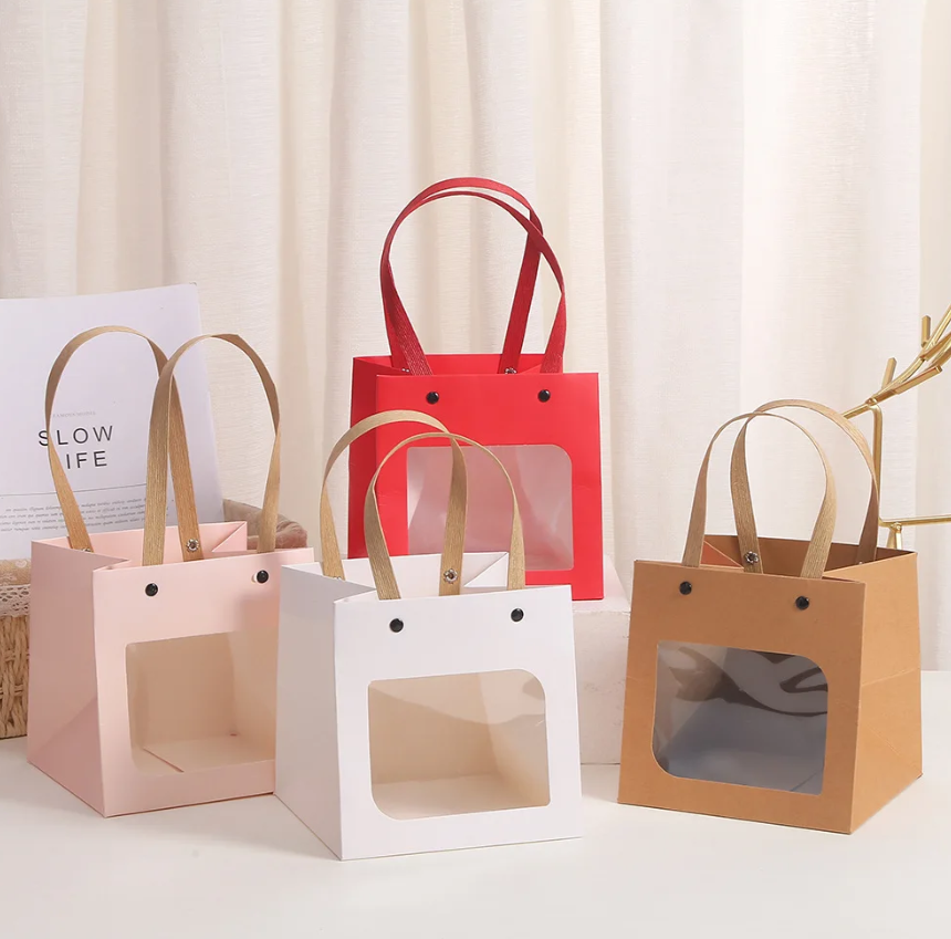 Valentine's Day Coated Kraft Paper Tote Bag with Transparent Square Window Smiley Flower Logo Printed Clothing Gift Packaging