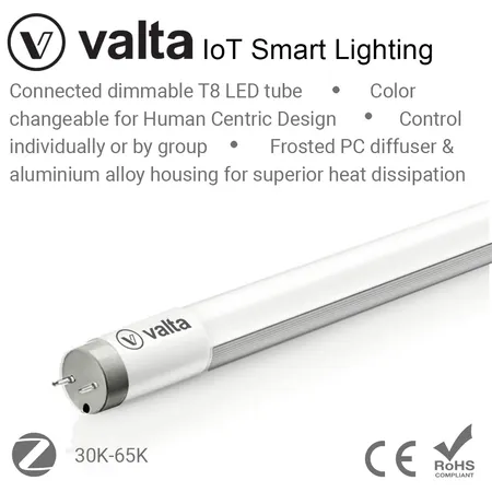 | 1222-21-02-C1 | Valta Connect Colormix Dim T8 1200 18W | 1200mm | 3000K-6500K | 18 W | 2484lm | G13 | Yes |