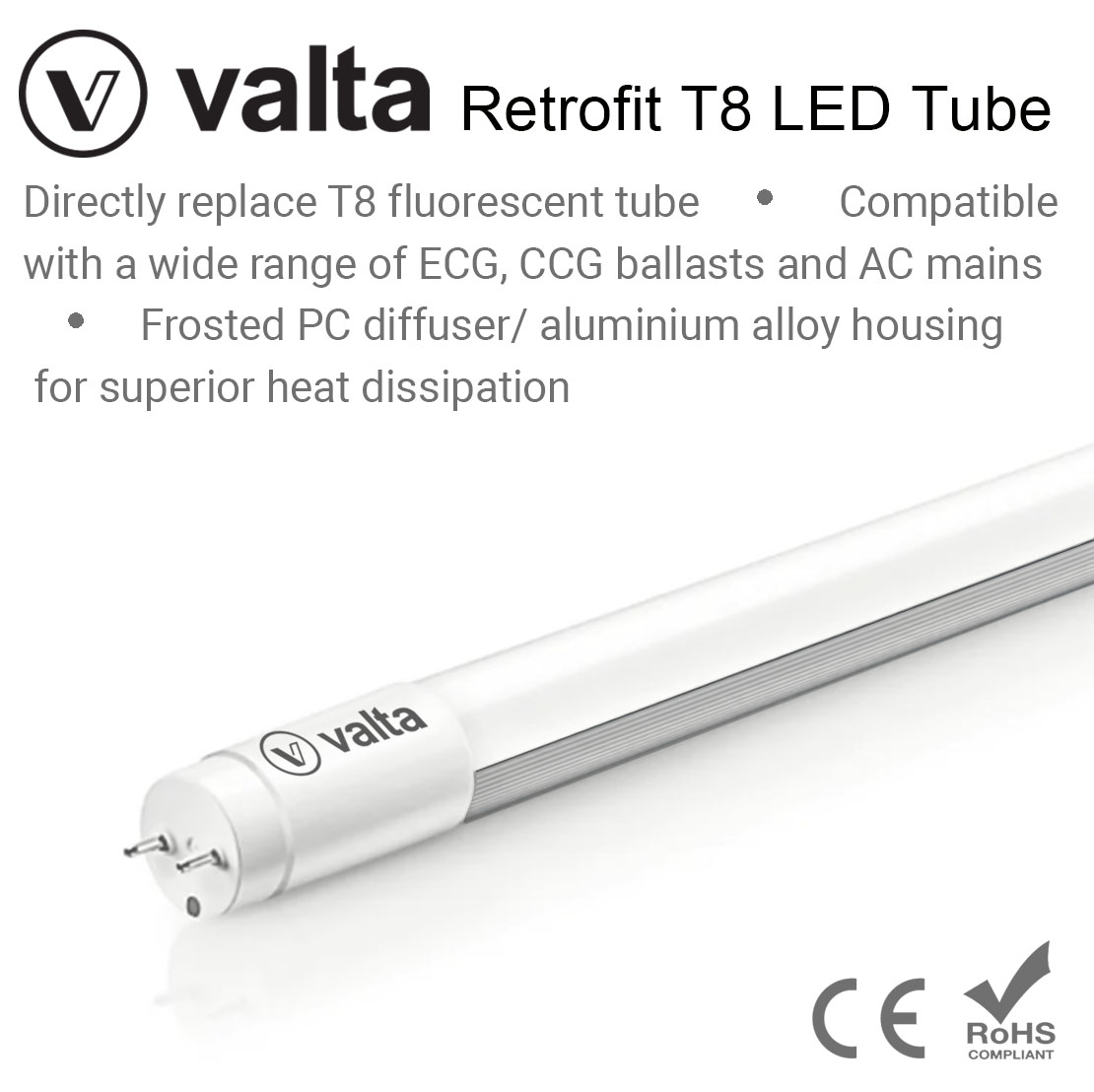 ** Actual power consumption of the LED Tube depends on the specification of the ballasts. As a rule of thumb, Valta Faci-Lite consumes about 50% of the fluorescent tube it replaces. Please check with your distributor on the actual power consumption for the ballast you intend to use with.