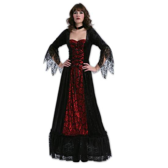 The vampiress costume is a long, black satin mesh dress with a long-sleeved satin cloak draped over. The mesh dress reaches the floor and is decorated in red roses. The sleeves are made from the same mesh, patterned with floral designs for creating a gothic look.