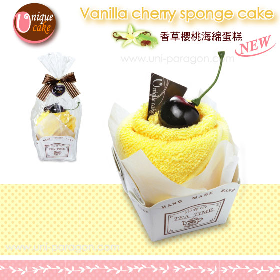 This eye-catching vanilla cherry songe cake is well packaged in a OPP bag. The towel is well woven and dyed with a vivid color. The cake is decorated with a lovely imitation cherry and a piece of imitation chocolate. This chic item is perfect for home decoration.