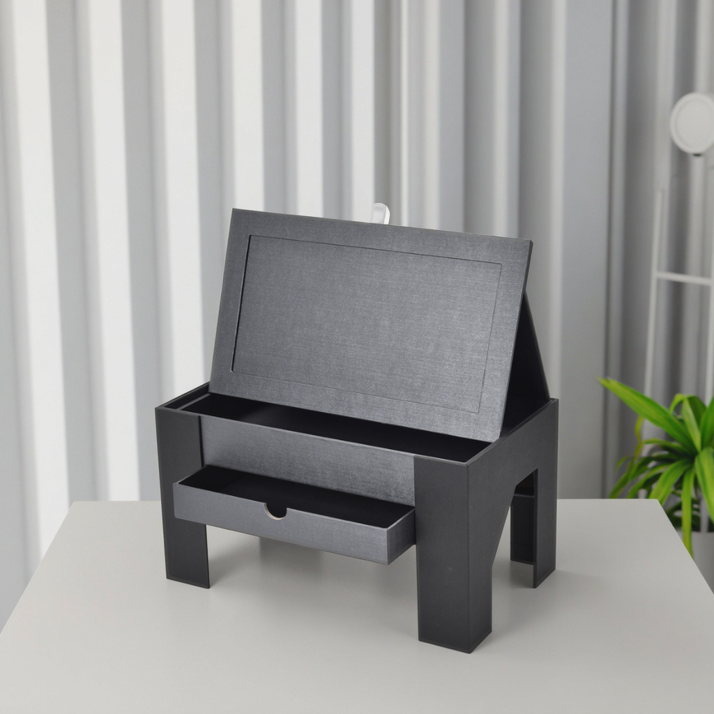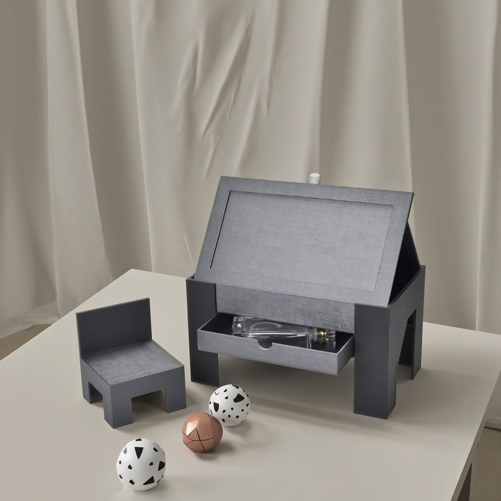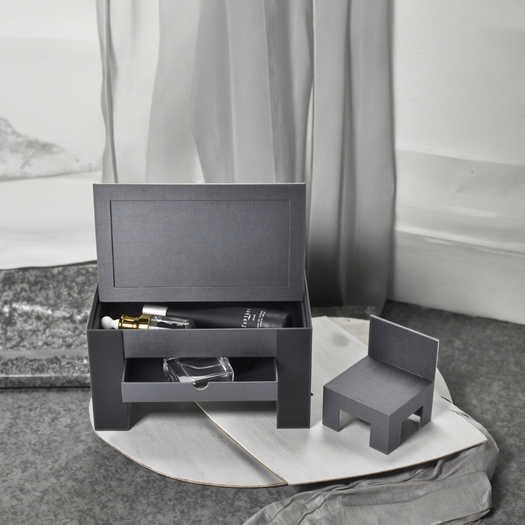 Grey board paper (300-2500gsm), with matte/pearlescent/wood grain special paper on the surface, table leg design, sturdy and full of high-end feel.