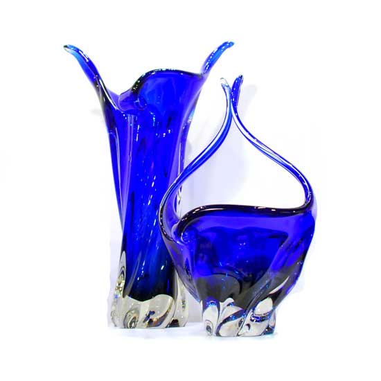 This is an ornate decorative vase set that is made of tinted crystal material. This beautiful crystal vase set includes two finely crafted vases with curved floral designs. Add this to your home for a touch of style.