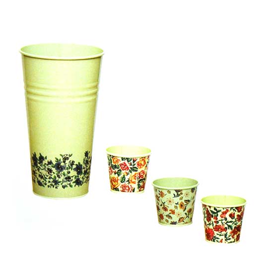 Showcased here is a four-piece vase set. It includes a big vase and three smaller ones. The vases are patterned with flowers of different colors. They can be used both indoors and outdoors.
