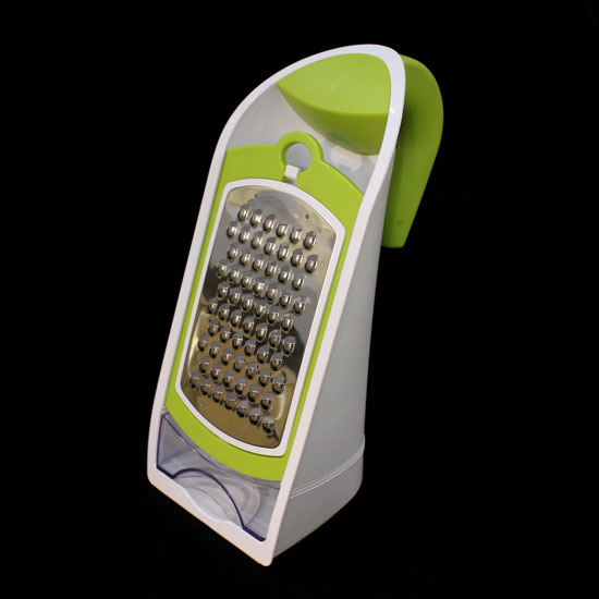 As shown is a vegetable grater coming with a stainless steel blade. The housing is designed with a container to keep the grated food. This grater is suitable to handle a range of food.