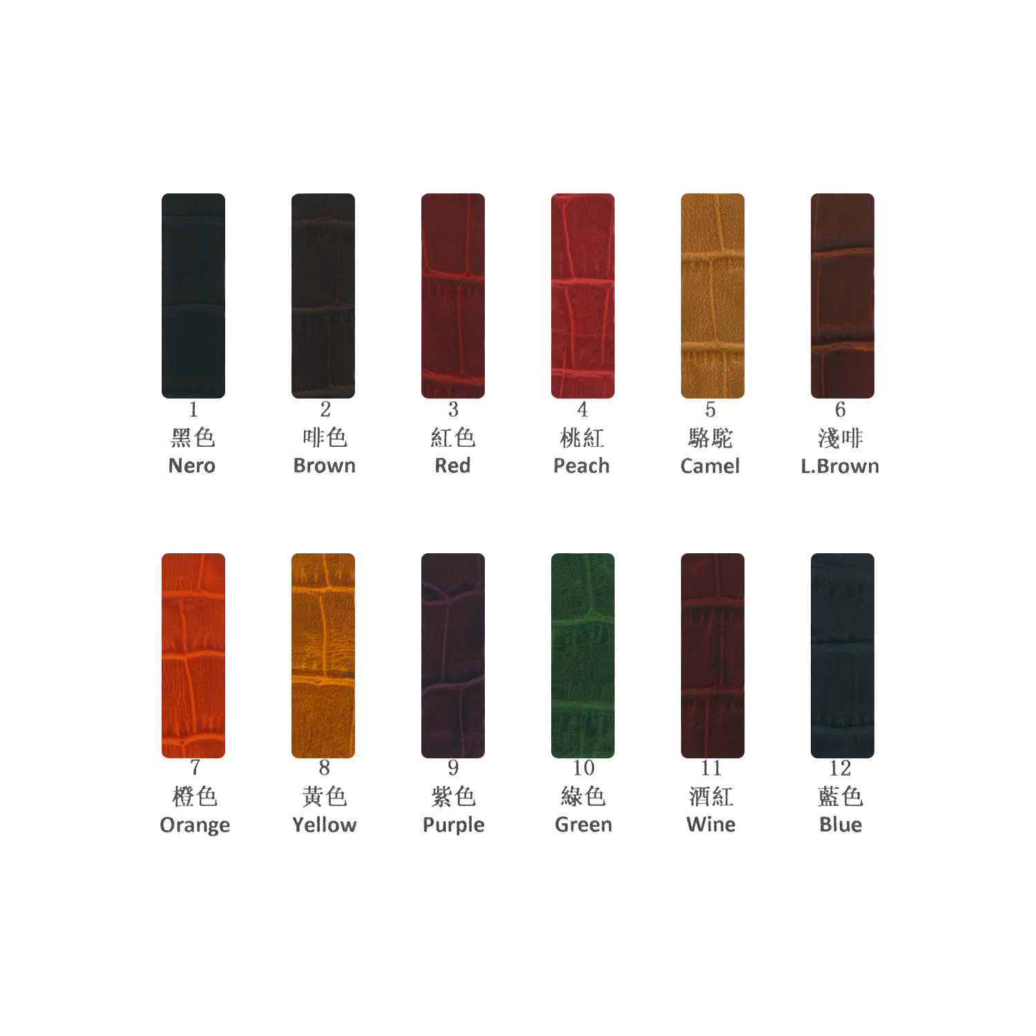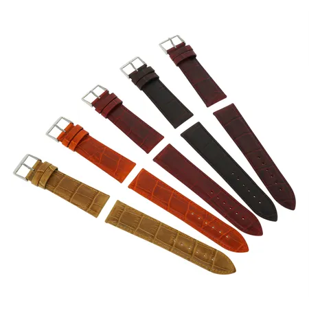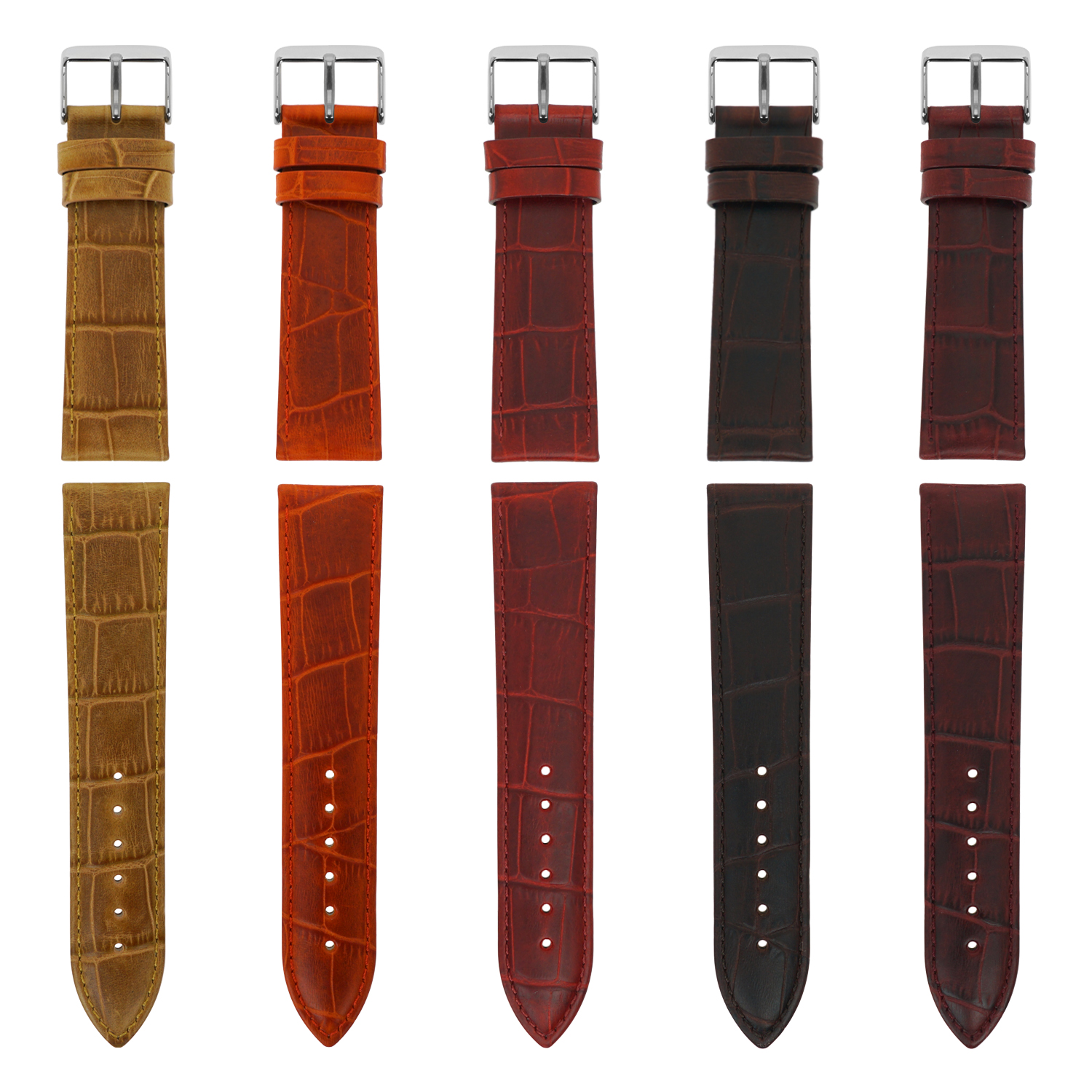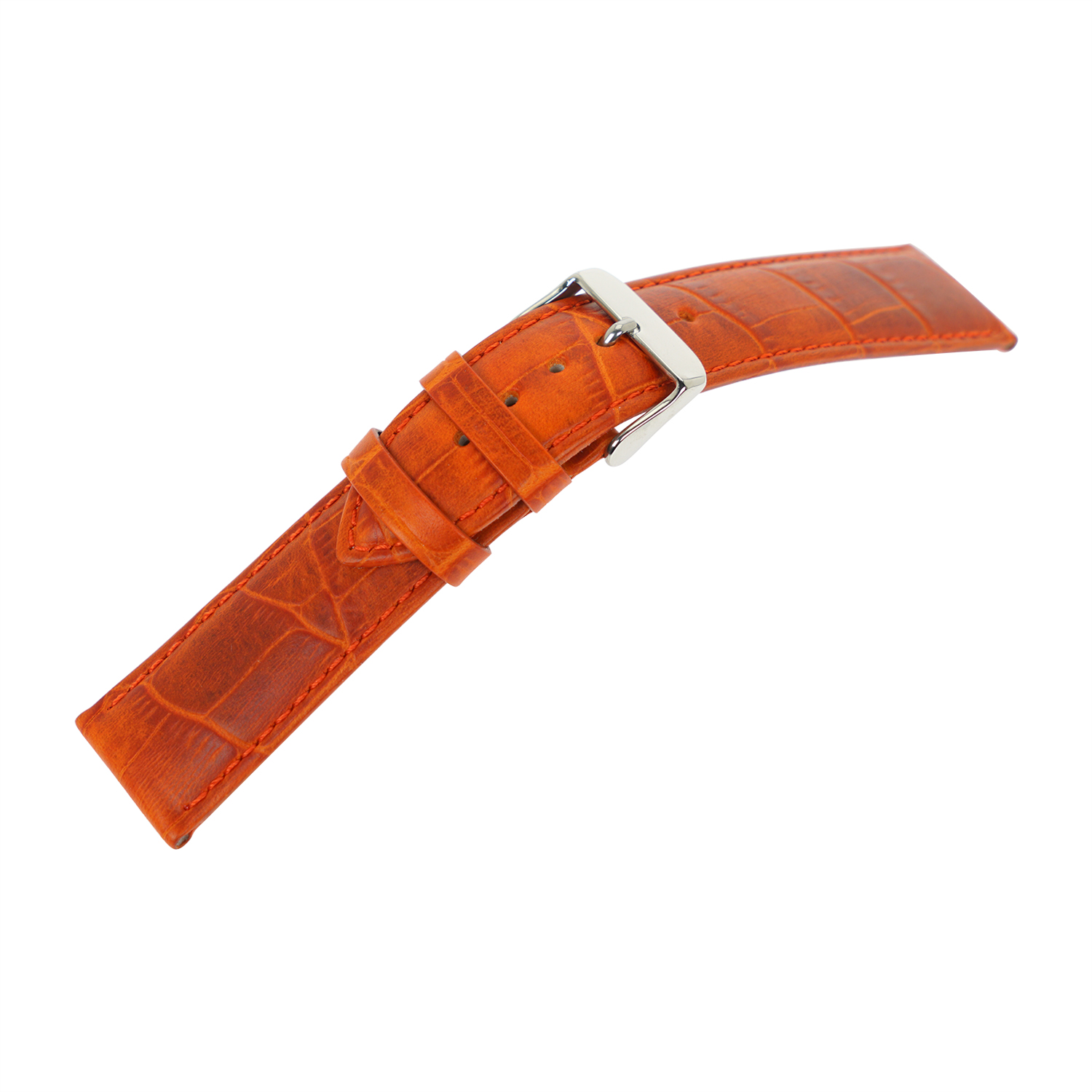 The highlighted crocodile grain watch strap is made of vegetable-tanned leather. It is completed with two loops and a stainless steel buckle. Embossed with a crocodile motif and adorned with matching stitches, this strap is elegance and refined appeal.