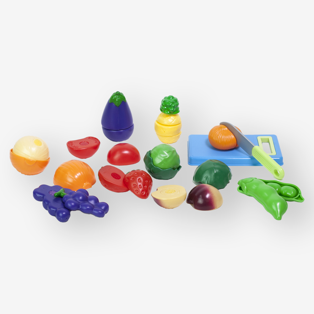 Our slice-able veggies are held together with self-stick tabs that make a satisfying 'crunch' when cut with the child-safe plastic knife. This set includes eleven realistic-looking food items that can be chopped/peeled into 26 separate pieces.
