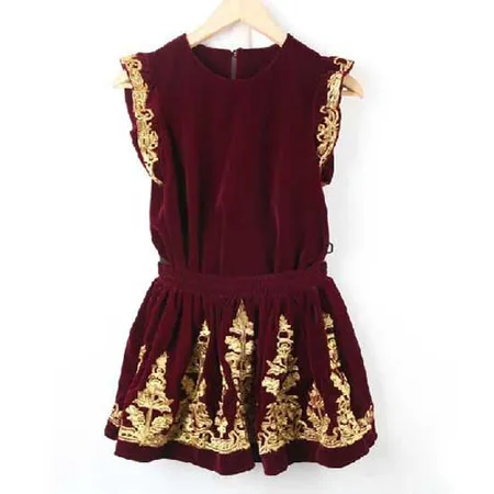 This is a velvet dress that boasts a sophisticated and elegant design. It is accented with golden-toned embroidered patterns for added glamor. This sleeveless dress is finished with a zip-up closure back.