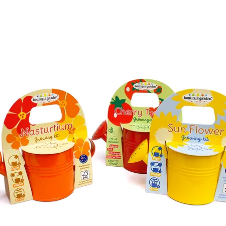 Vibrant-coloured kids' watering cans include soil & seeds with stickers for children to personalize their own unique mini gardens.