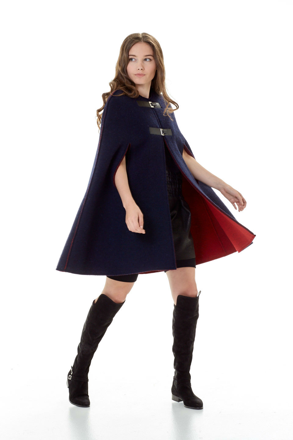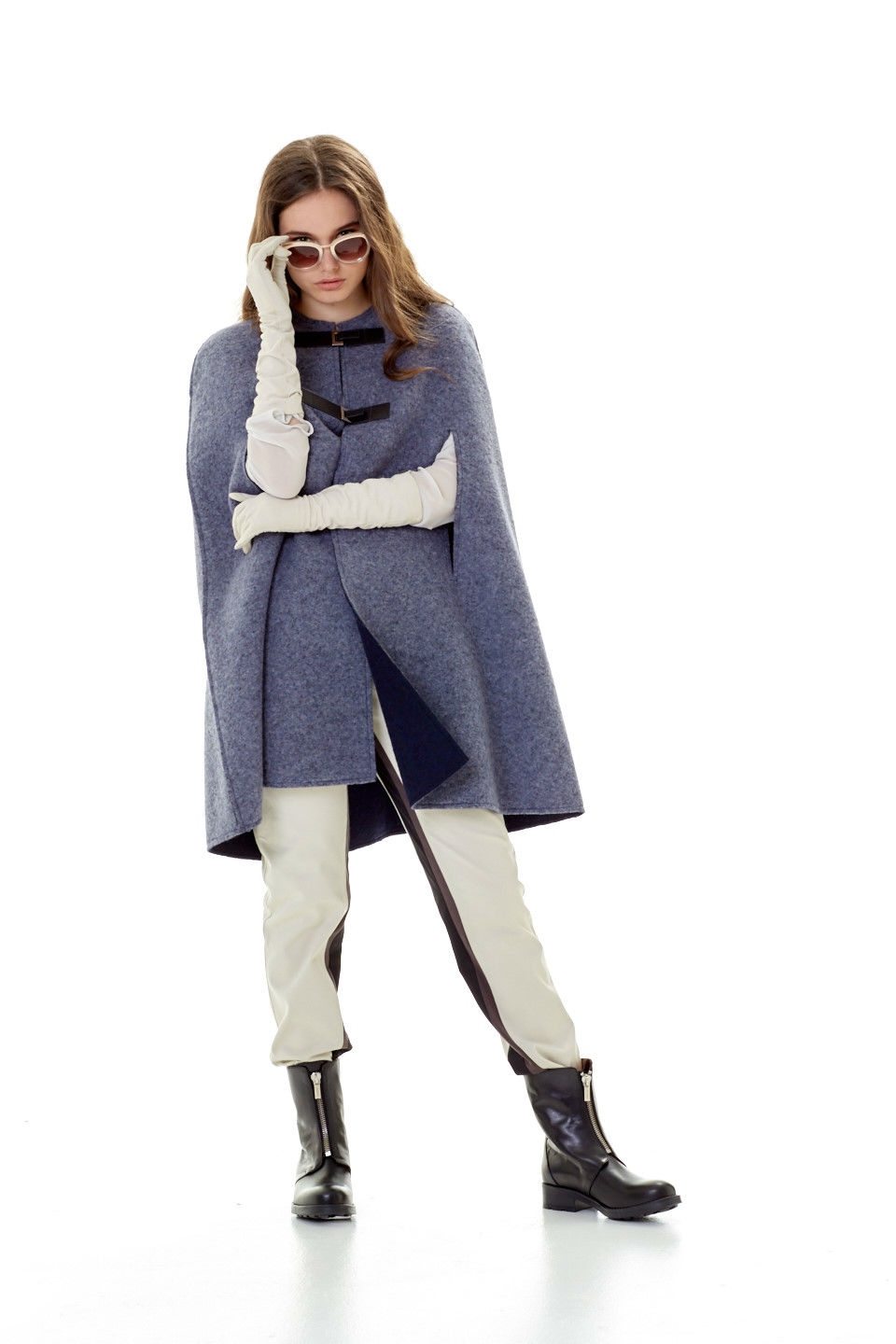Victoria Cape is a fashionable item with no sleeves. It's designed and made in Latvia from Italian 100% wool boiled wool fabric with double sided colour finish. It's light and warm, easy to match with the skirt or trousers.