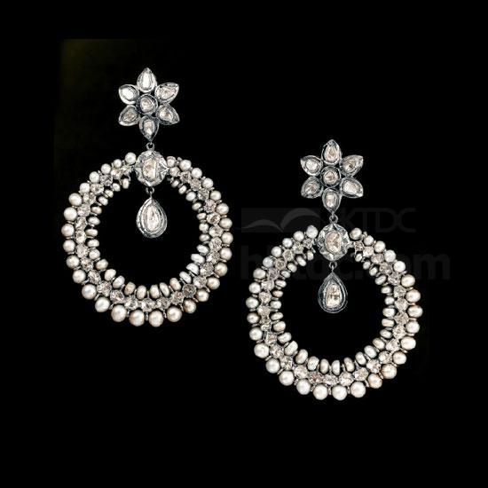 This is a pair of silver earrings with a fashionable and modern design. The earrings are crafted with sparkling diamonds and precious pearls for added elegance. This pair of Victorian earrings makes a pretty way to complement your chic look.