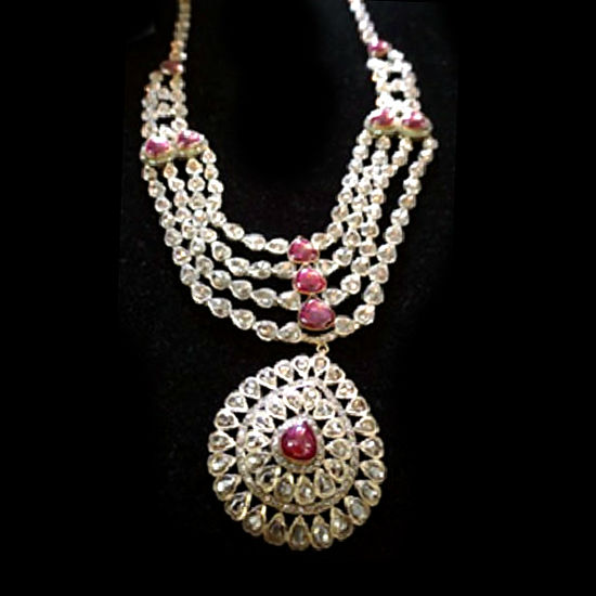 Victorian & Vintage Style 3 line Pendant Necklace in Sterling Silver & 14K Yellow Gold with Top Quality African Rubies and Polki & Full Cut Diamonds. The Stone casing made in 14K Yellow Gold. Can be made as per Custom design with changes in Length, Width and weights.