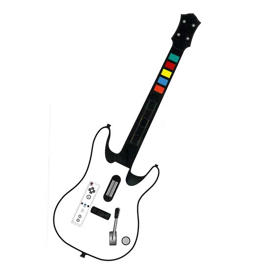 This video game guitar controller works with all video guitar games on PS2, PS3 and Wii. It boasts a detachable neck for convenient storage and