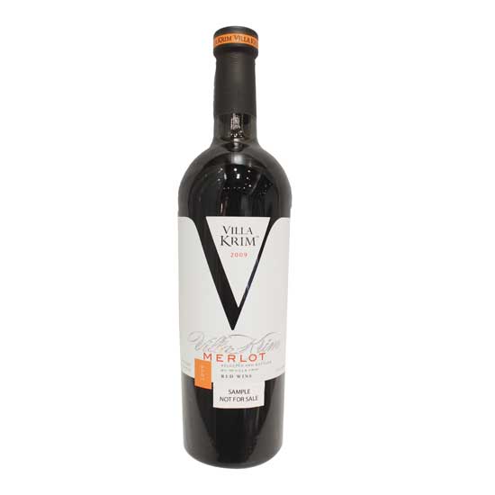Displayed is a bottle of Merlot that originates from Ukraine. This wine has a bright color and a bouquet with notes cherry. This high quality red wine is ideal to go with meals.
