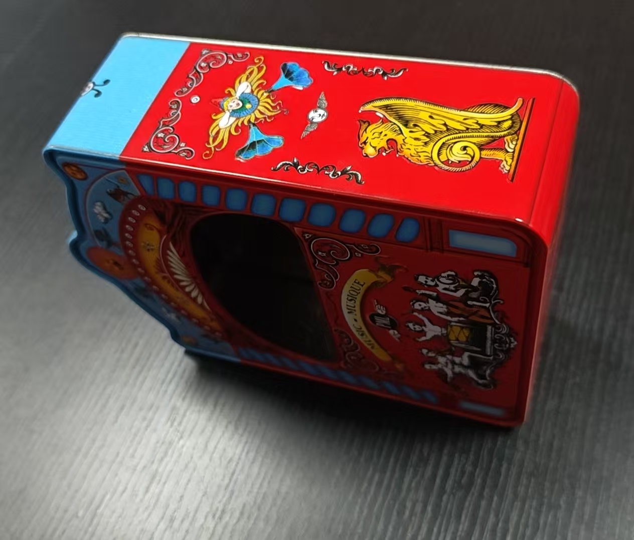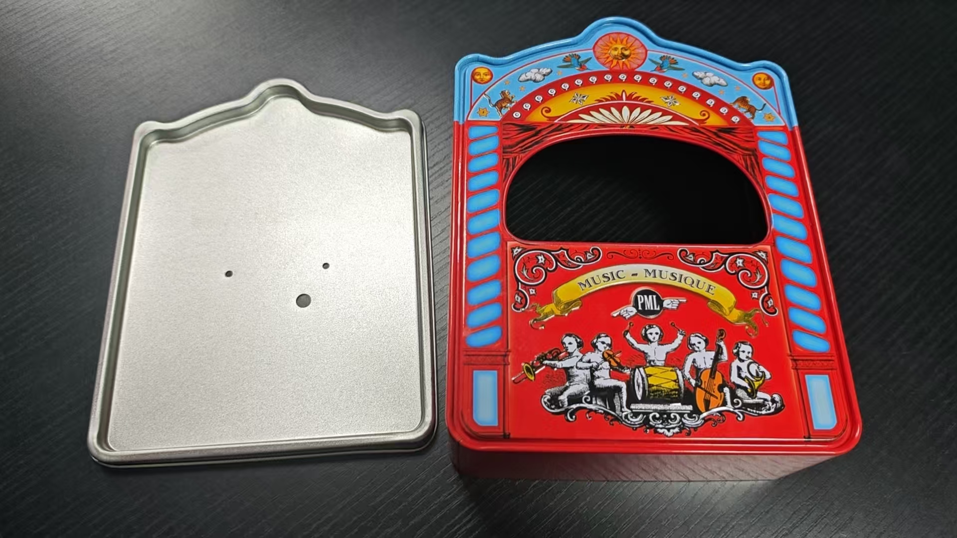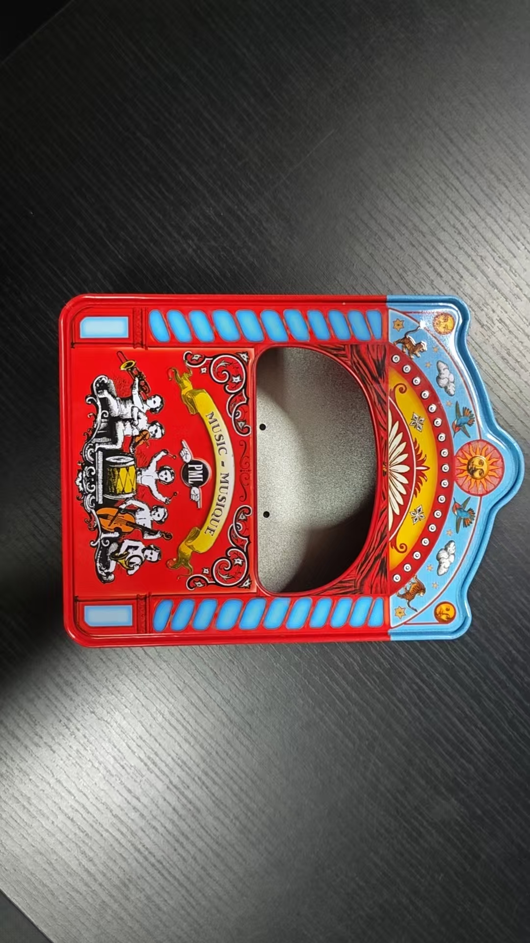 From the perspective of exterior design, the tin box adopts a distinct red and blue contrasting color scheme, which has a strong visual impact and instantly awakens people's childhood memories of the classic circus. On the left side of the box, with a bright red base, there is an illustration of a black and white retro style circus band: five musicians are lively in posture, playing trumpet, violin, drum, cello, and saxophone respectively. The dynamic lines and exaggerated shapes are full of retro childlike charm, as if you can hear cheerful music flowing out. There is a bright yellow ribbon wrapped around the center of the band, printed with the words "MUSIC MUSIQUE", which not only highlights the music theme but also strengthens the French retro atmosphere. The "PML" logo next to it adds a retro brand sense. The illustrations are adorned with curled patterns and star patterns, and the delicate lines replicate the texture of retro printing from the 19th century, giving the overall design a more vintage charm.
