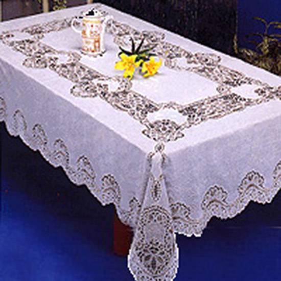 The featuring item is a vinyl lace tablecloth with embossed floral and botanical patterns. The rectangular tablecloth is suitable for six-seat tables, and is also available in other sizes, colours and designs.