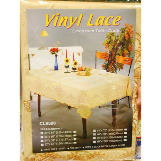 The vinyl table cloth boasts embossed embroidery design to showcase an elegant touch. It is easy to clean and maintain. Dress up your dining table with this vinyl lace table cloth.