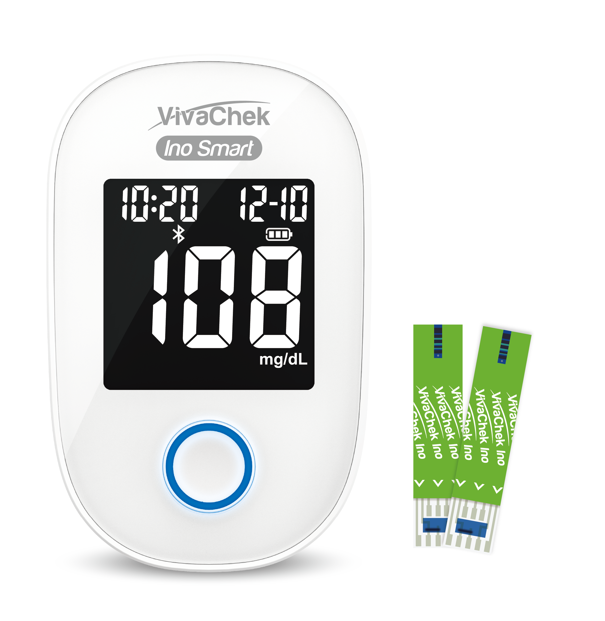 VivaChek Ino Smart blood glucose monitoring system with connectivity for home use. It features bluetooth data transmission. The meter have large LCD with backlight.