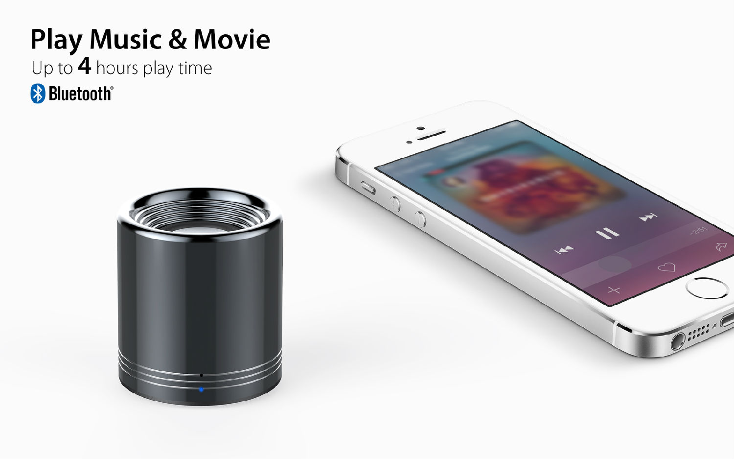 Portable bluetooth speaker Hands free speakerphone Up to 10m transmission distance Aluminum housing Built In rechargeable battery Output power 3W, acoustic sound, rich bass 1 hour recharge, up to 4 hours play time USB to Micro USB charging cable and 3.5mm audio cable included
