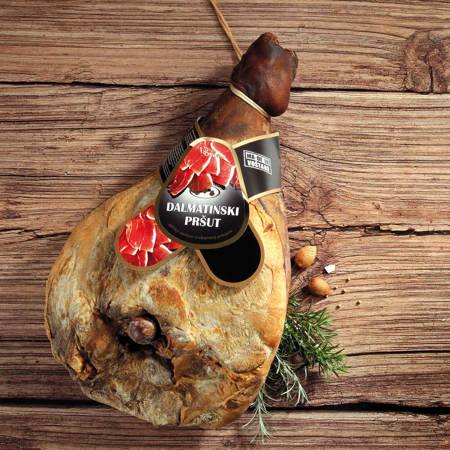 Dalmatian prosciutto is a cured meat product, made from fresh pork ham with bone. Fresh pork ham is salted with sea salt, smoked and matured no less than 12 months. Dalmatian prosciutto is a product protected with a geographical origin indicator. The uniqueness of a Dalmatian prosciutto comes from its traditional and natural production process that excludes adding any preservatives and/or additives. Dalmatian prosciutto must not contain any additives, the only thing that is being added is sea salt.