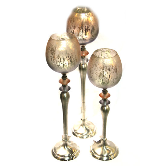 Featured are votive holders with a vintage-inspired design. The votive holders are delicately made of pewter metal with every small attention paid attention to. The glass shades deliver soft and gentle rays with grace.