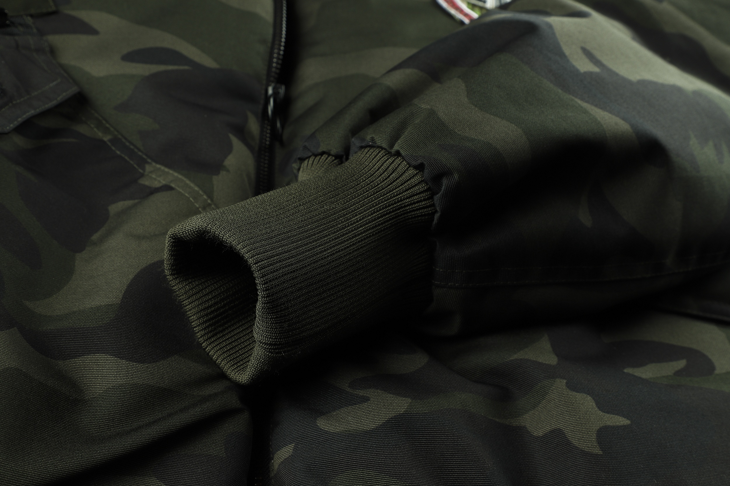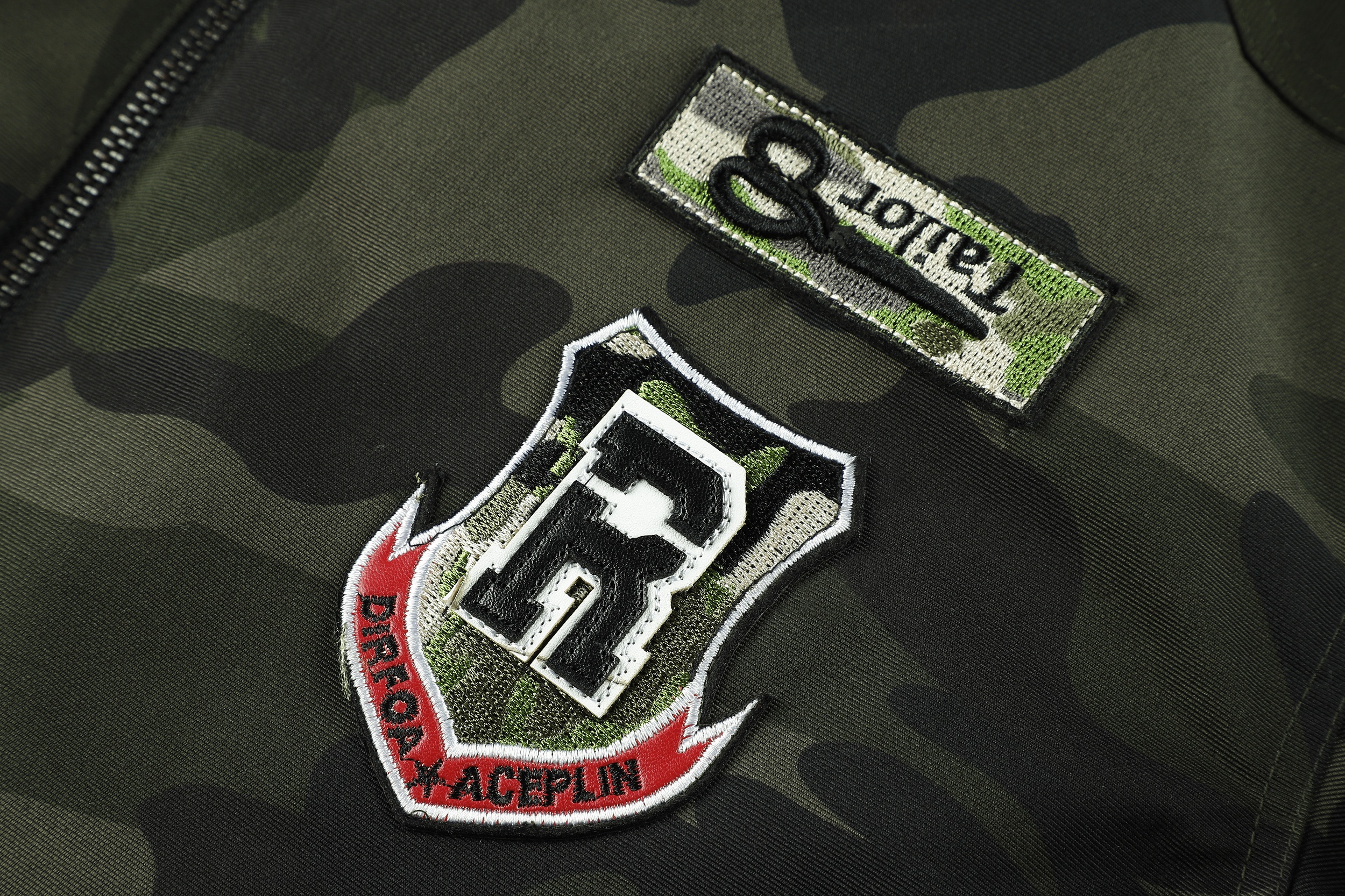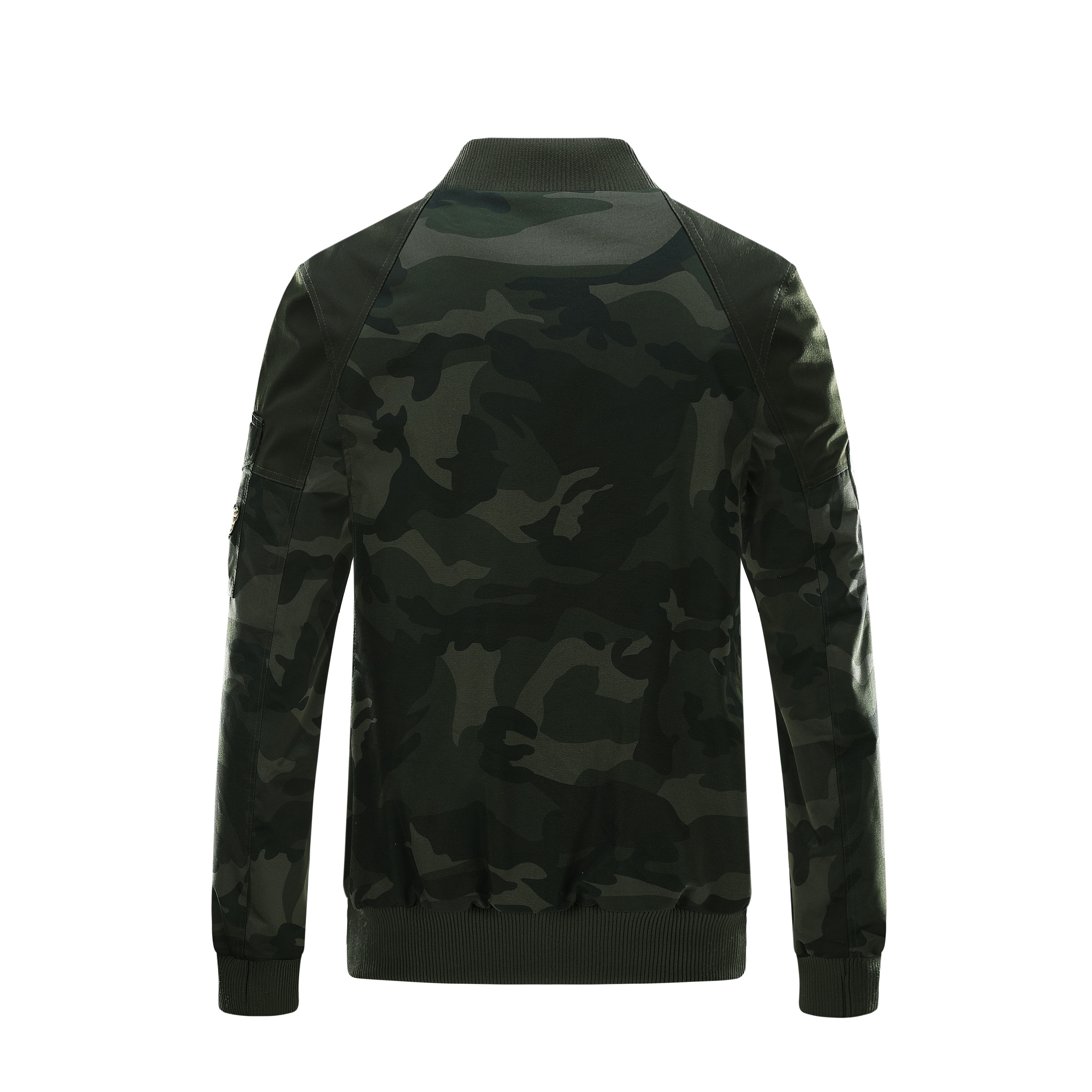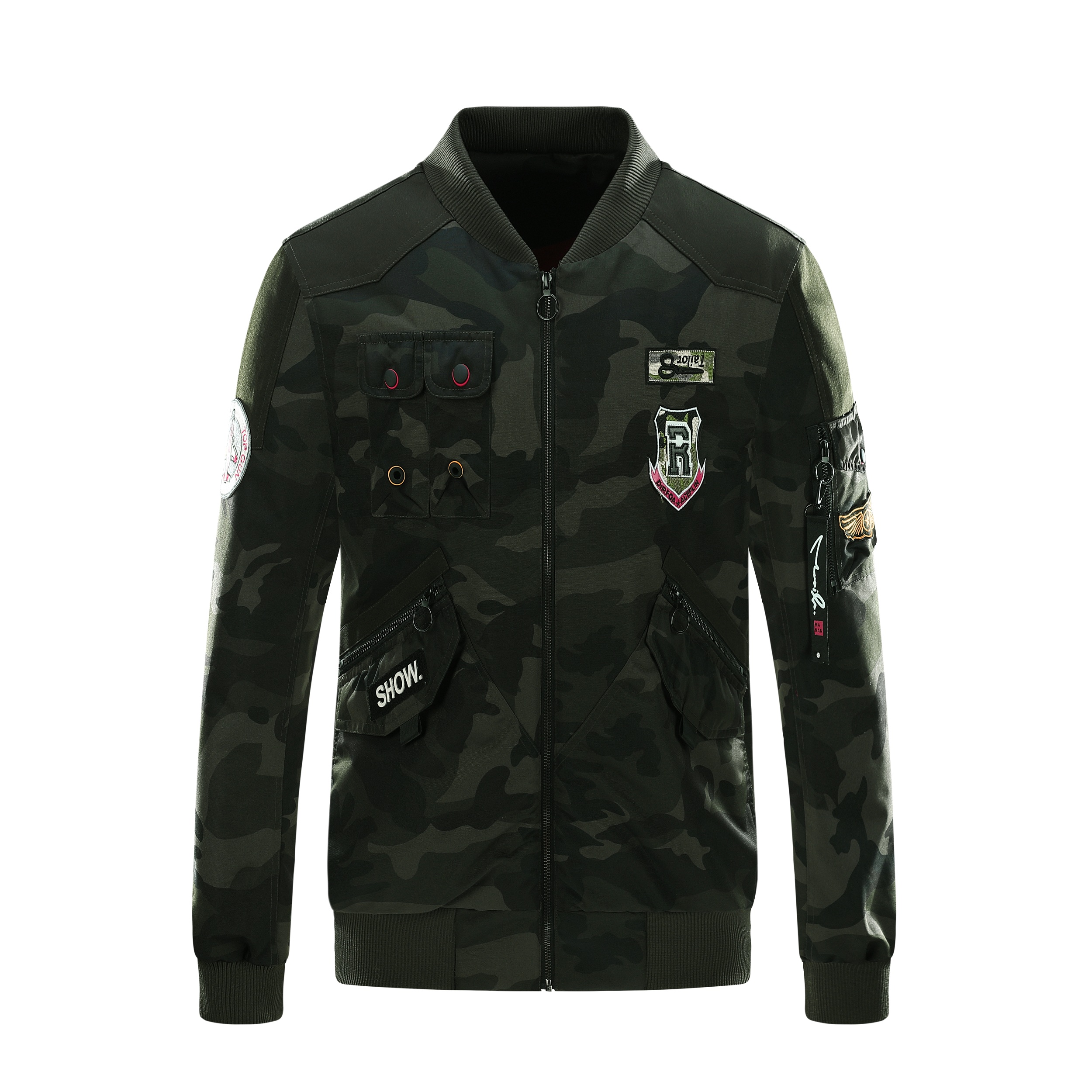 The image shows a black jacket with a camouflage pattern, featuring a mix of dark and lighter black shades to create the camo effect. The jacket is designed with a stand-up collar and a front zipper for closure. It includes several pockets: two chest pockets with flaps and buttons, and two side pockets, one of which is visible. The jacket is adorned with various patches and badges, including a prominent one on the left chest with a shield design and lettering, and others on the sleeves and near the waist. These patches add a decorative and possibly brand-identifying element to the jacket. The cuffs and waistband appear to be elasticized, which helps to retain warmth. The overall style of the jacket suggests a military or outdoor utility influence, making it suitable for casual wear or potentially for enthusiasts of military-style apparel.