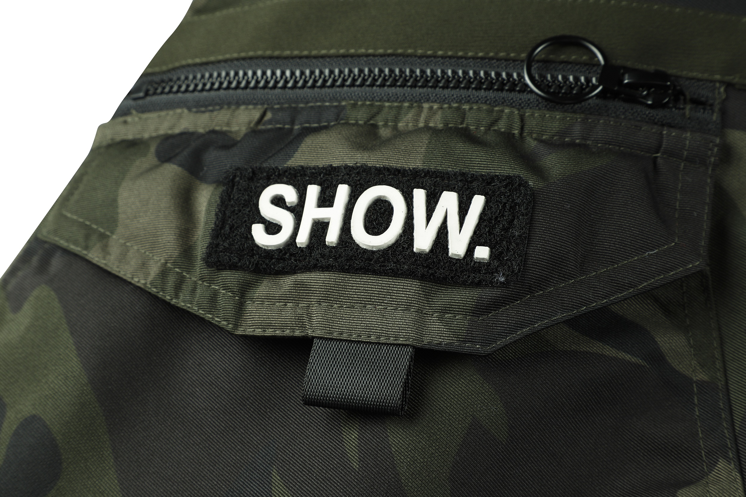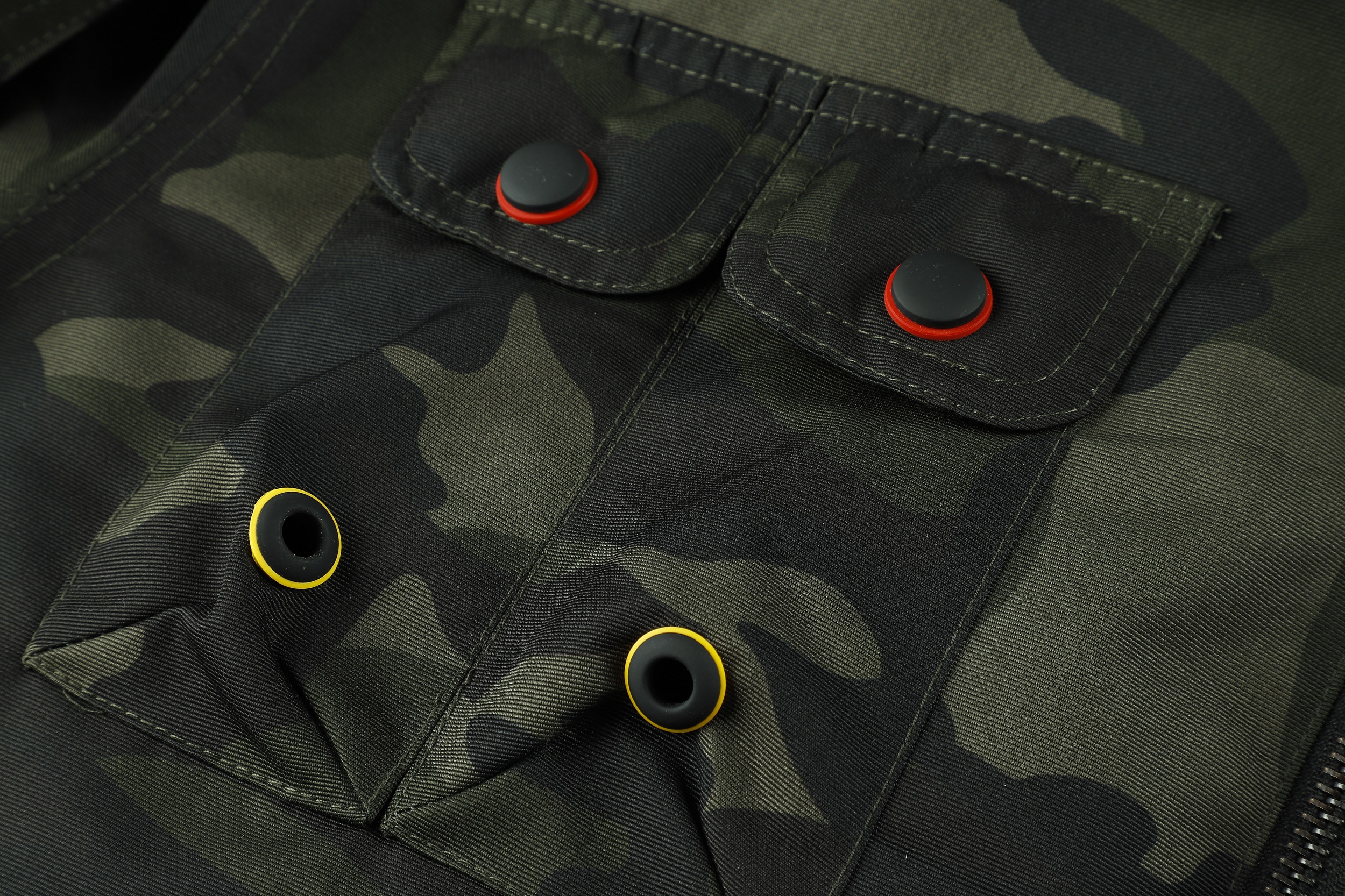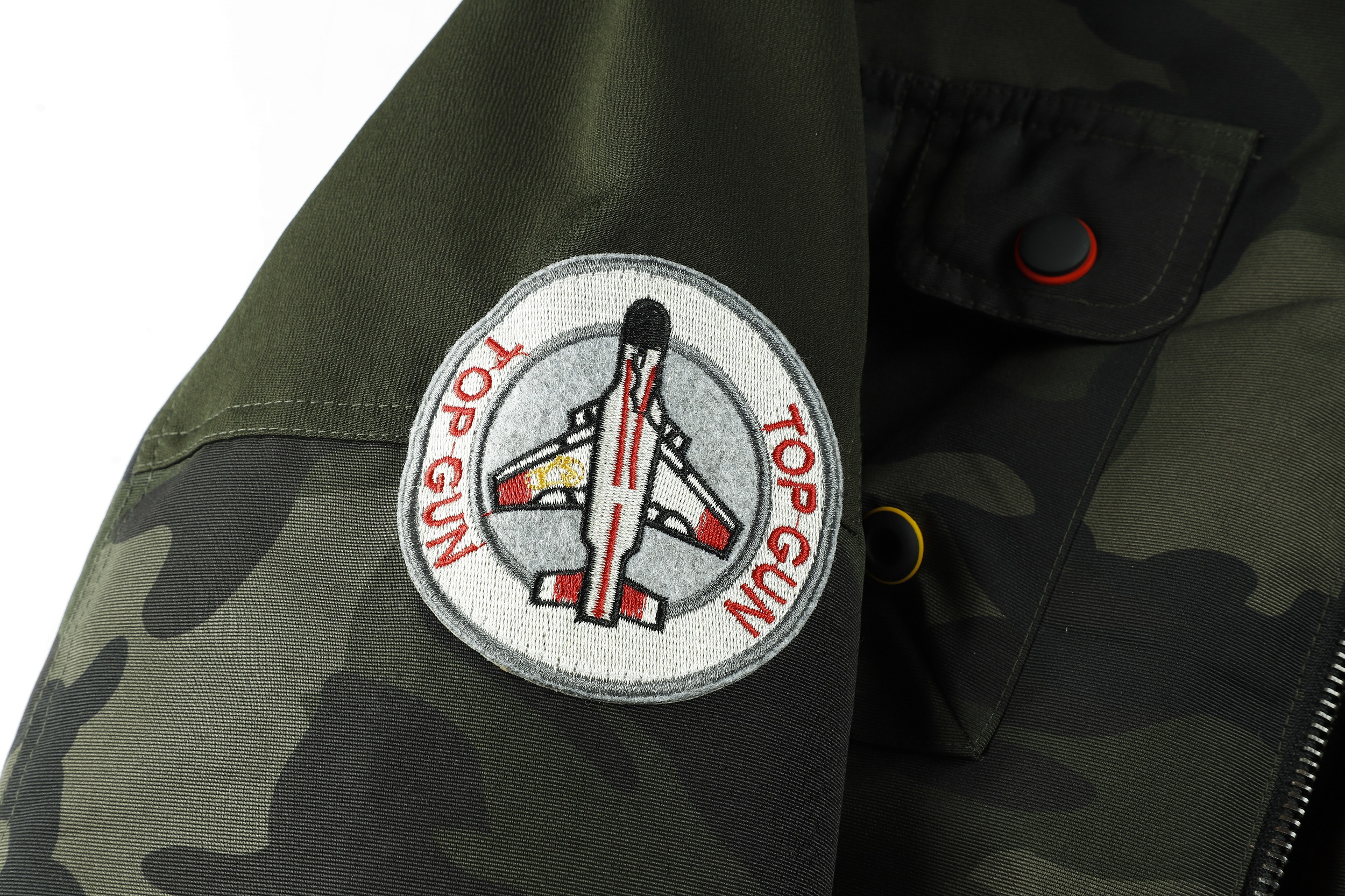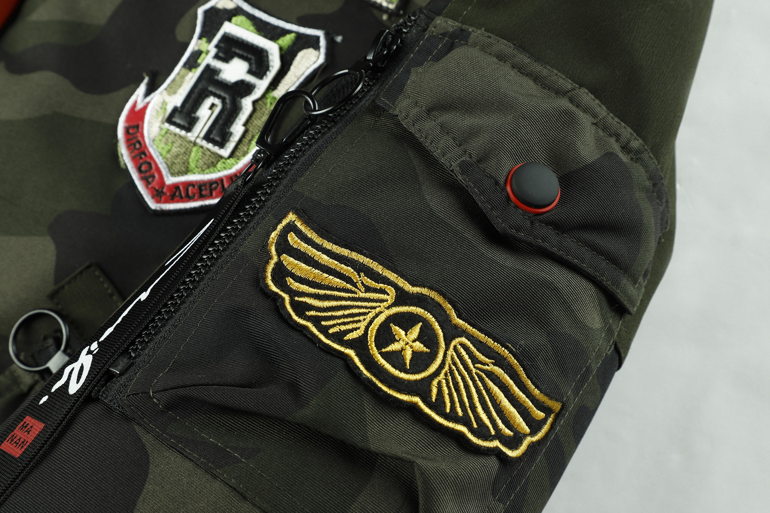 The image shows a black jacket with a camouflage pattern, featuring a mix of dark and lighter black shades to create the camo effect. The jacket is designed with a stand-up collar and a front zipper for closure. It includes several pockets: two chest pockets with flaps and buttons, and two side pockets, one of which is visible. The jacket is adorned with various patches and badges, including a prominent one on the left chest with a shield design and lettering, and others on the sleeves and near the waist. These patches add a decorative and possibly brand-identifying element to the jacket. The cuffs and waistband appear to be elasticized, which helps to retain warmth. The overall style of the jacket suggests a military or outdoor utility influence, making it suitable for casual wear or potentially for enthusiasts of military-style apparel.