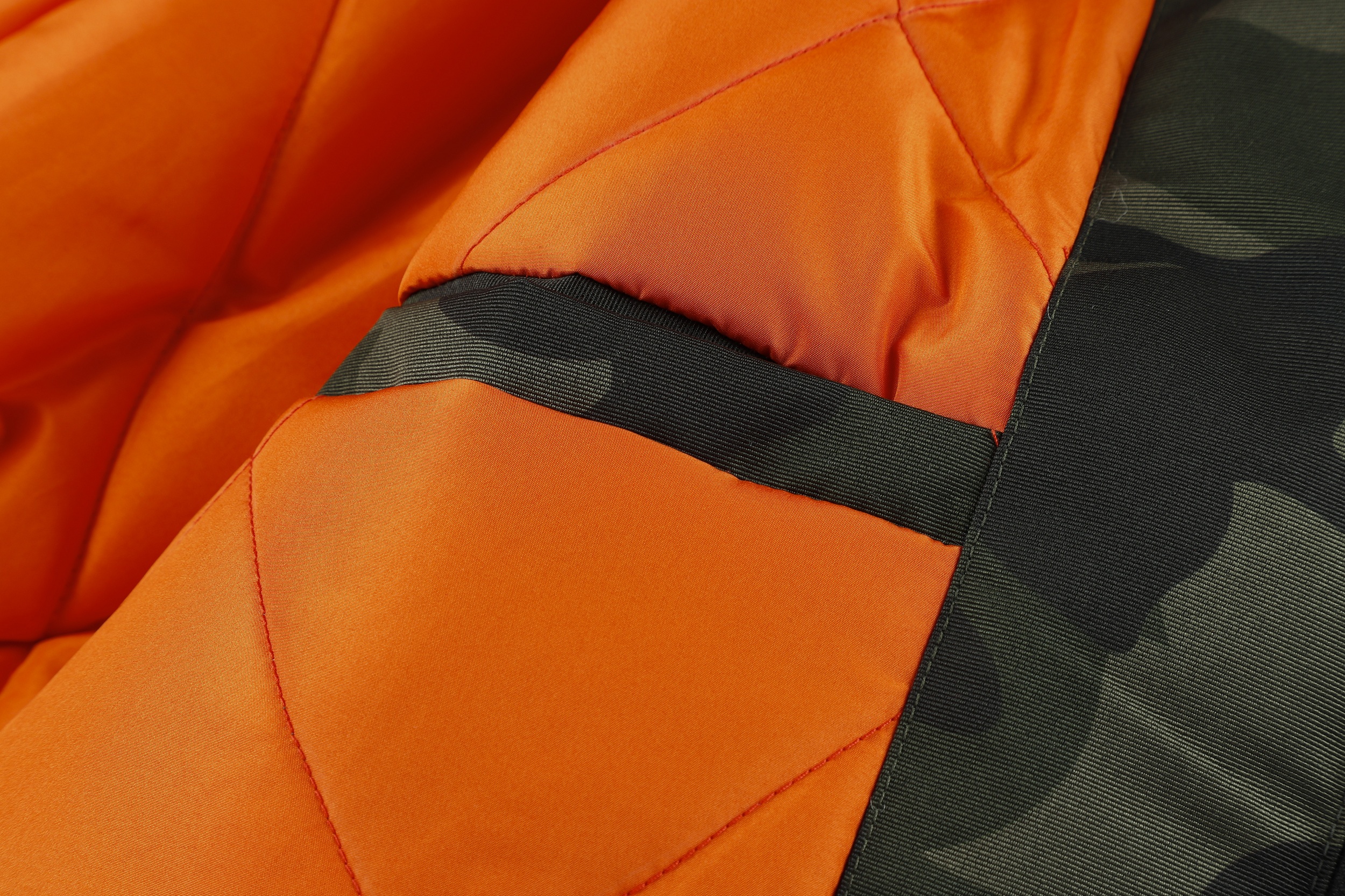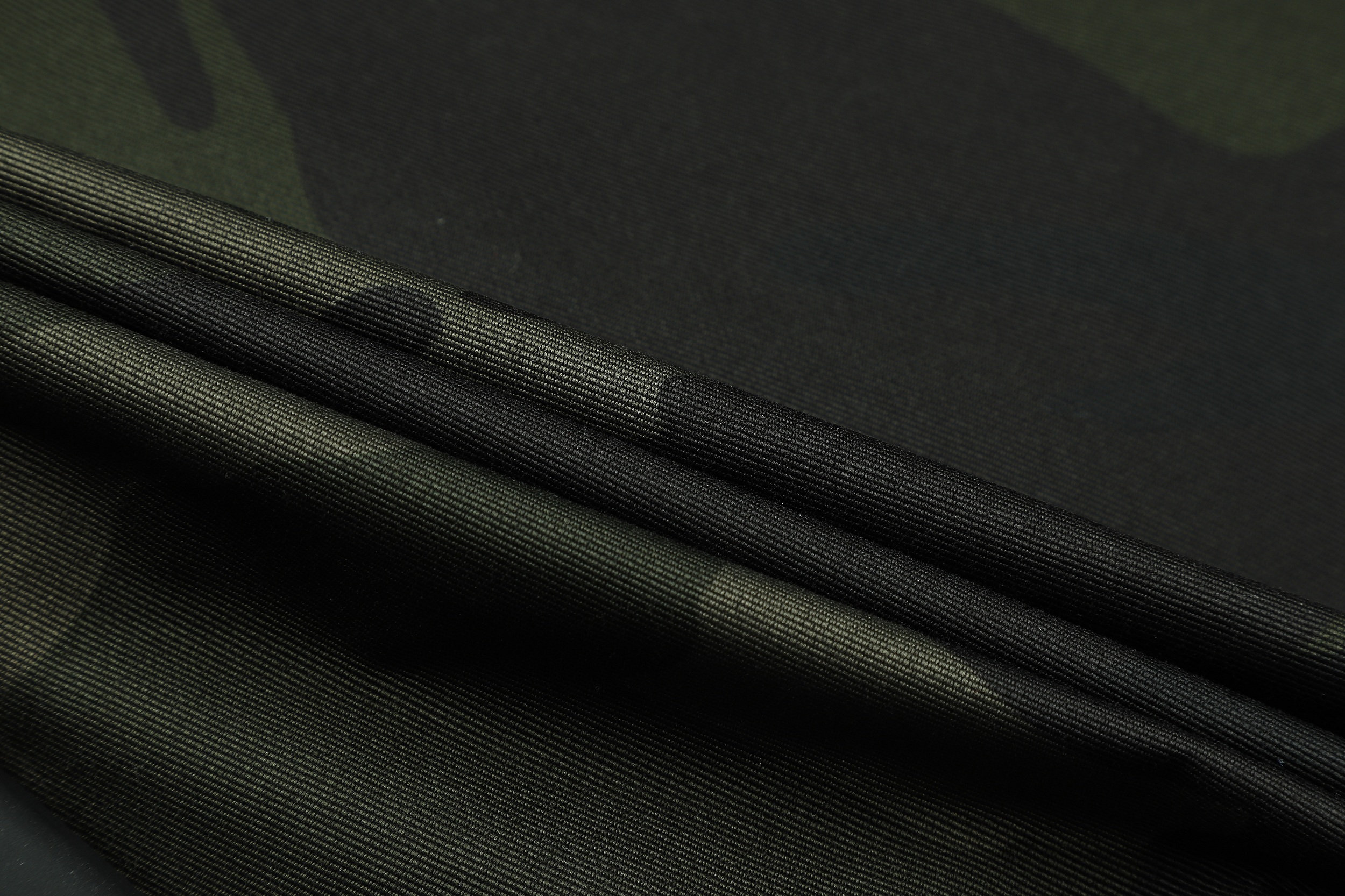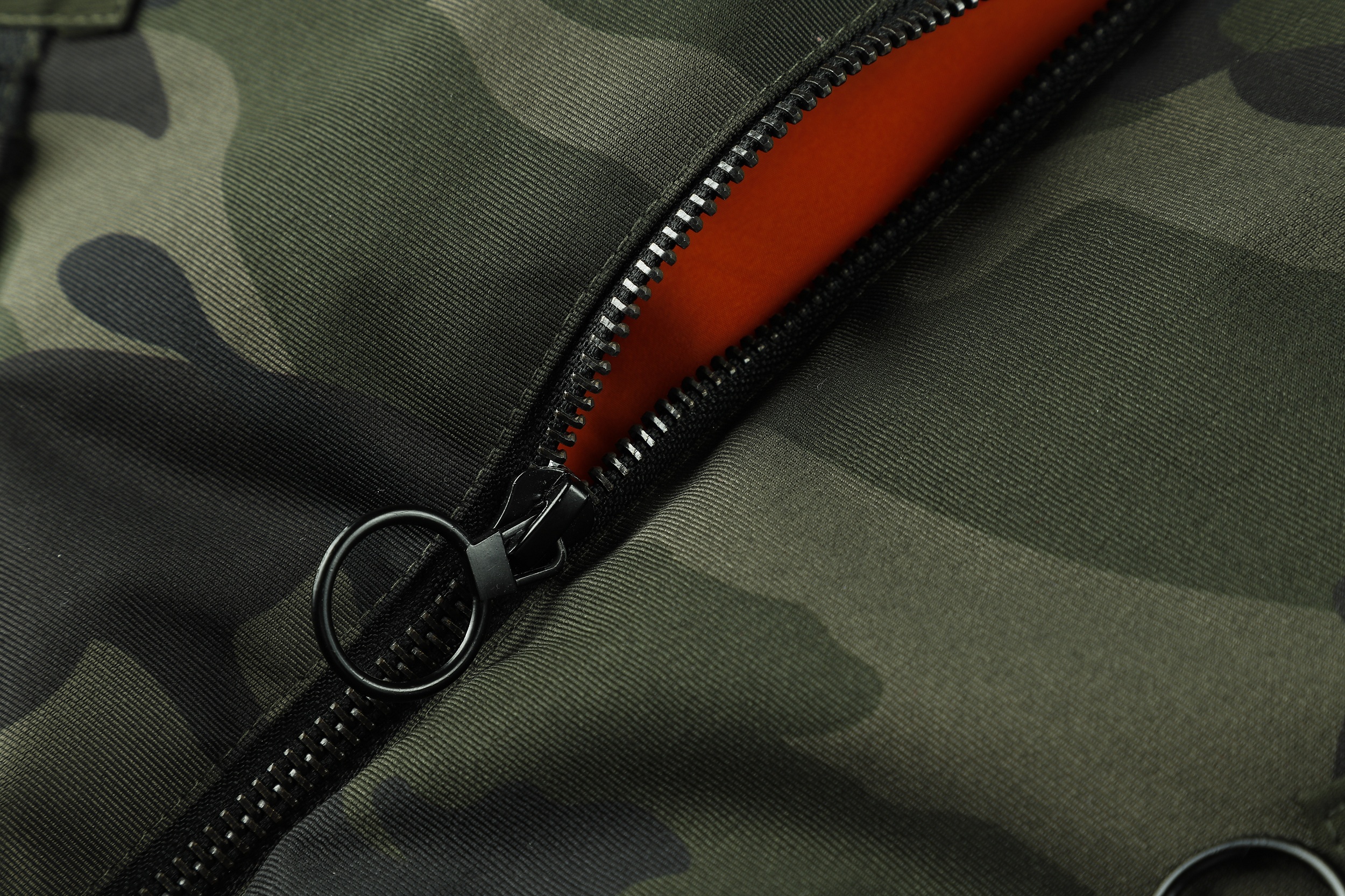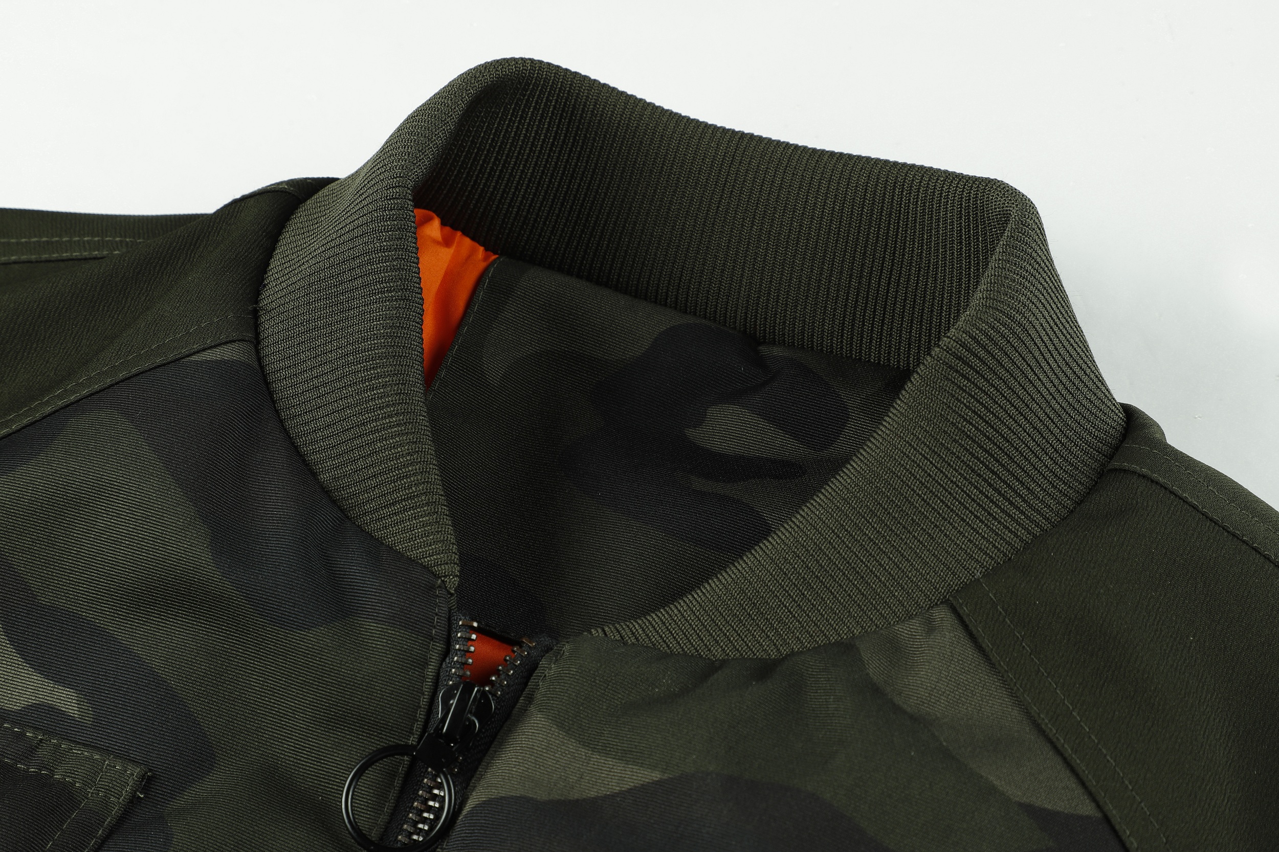 The image shows a black jacket with a camouflage pattern, featuring a mix of dark and lighter black shades to create the camo effect. The jacket is designed with a stand-up collar and a front zipper for closure. It includes several pockets: two chest pockets with flaps and buttons, and two side pockets, one of which is visible. The jacket is adorned with various patches and badges, including a prominent one on the left chest with a shield design and lettering, and others on the sleeves and near the waist. These patches add a decorative and possibly brand-identifying element to the jacket. The cuffs and waistband appear to be elasticized, which helps to retain warmth. The overall style of the jacket suggests a military or outdoor utility influence, making it suitable for casual wear or potentially for enthusiasts of military-style apparel.
