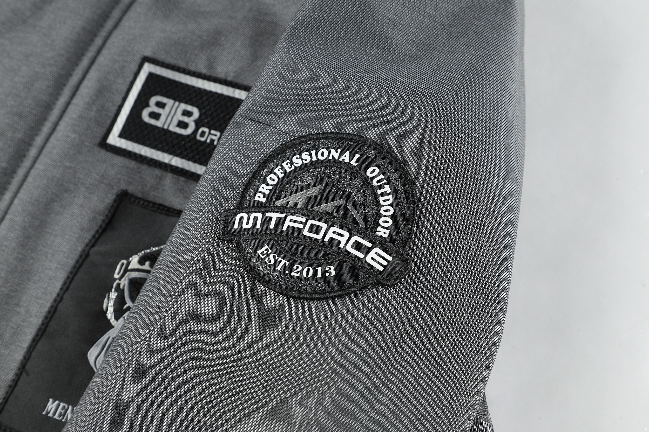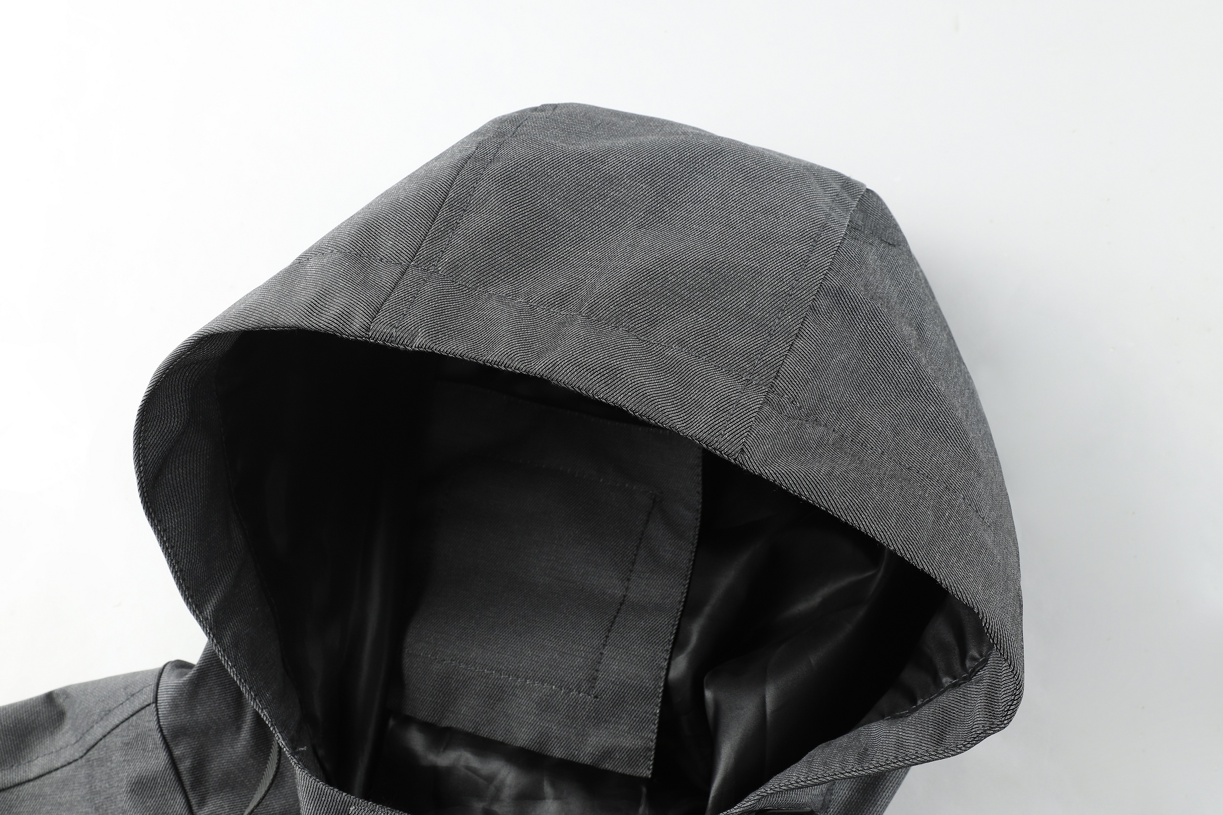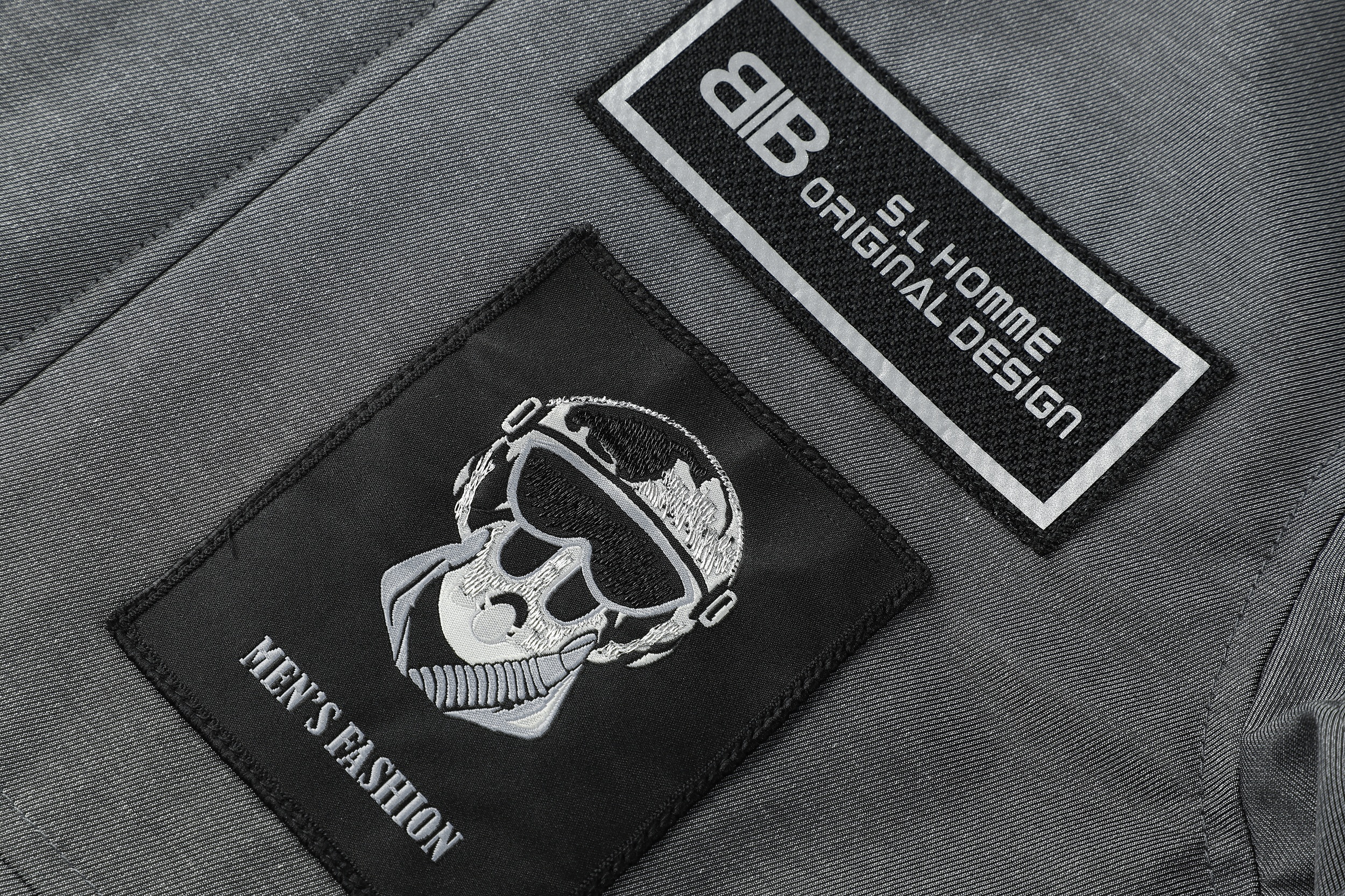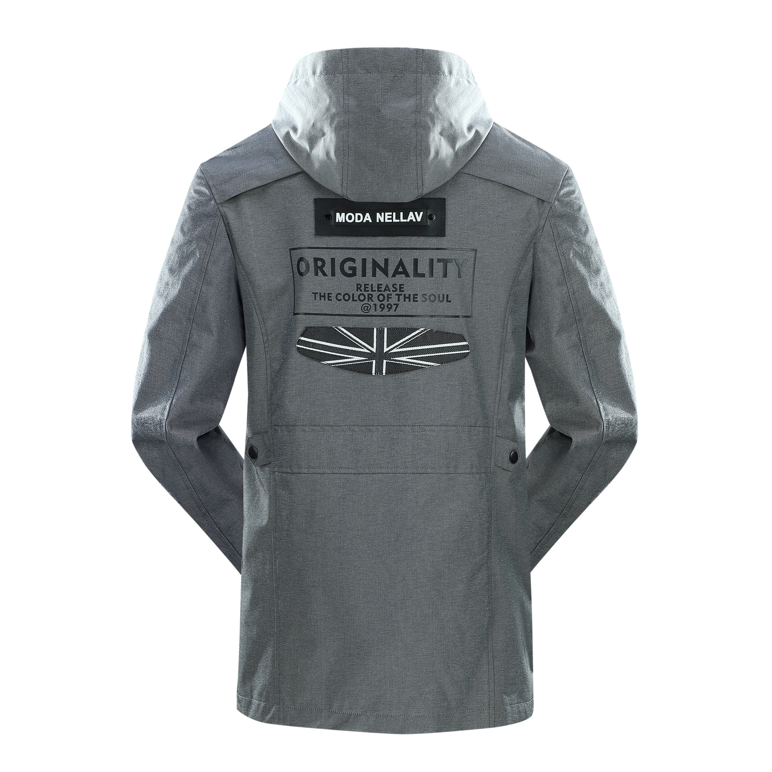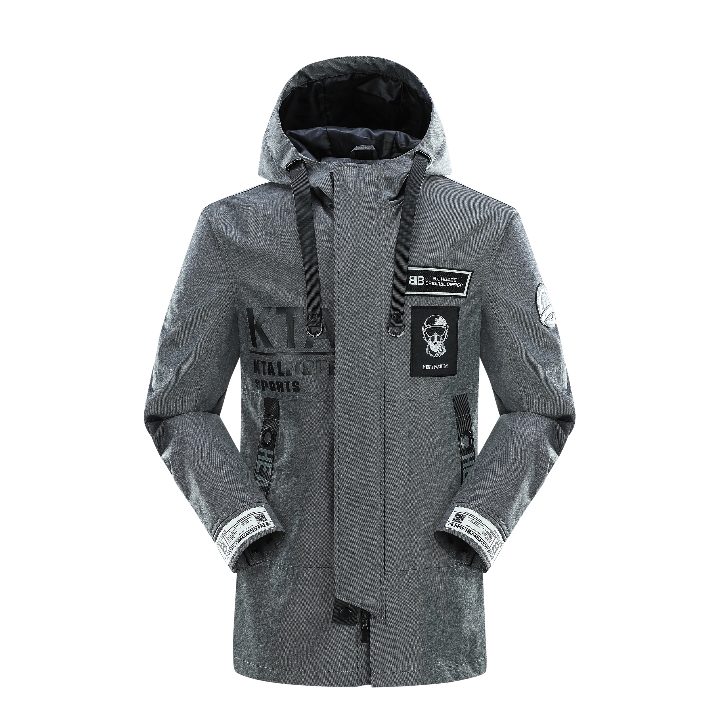The jacket features a hooded collar, a zippered front, and white trim at the cuffs. There is a badge on the left chest area that appears to have text and a design on it. On the right side of the jacket, there is a small pocket with another badge. The overall design looks modern and stylish.