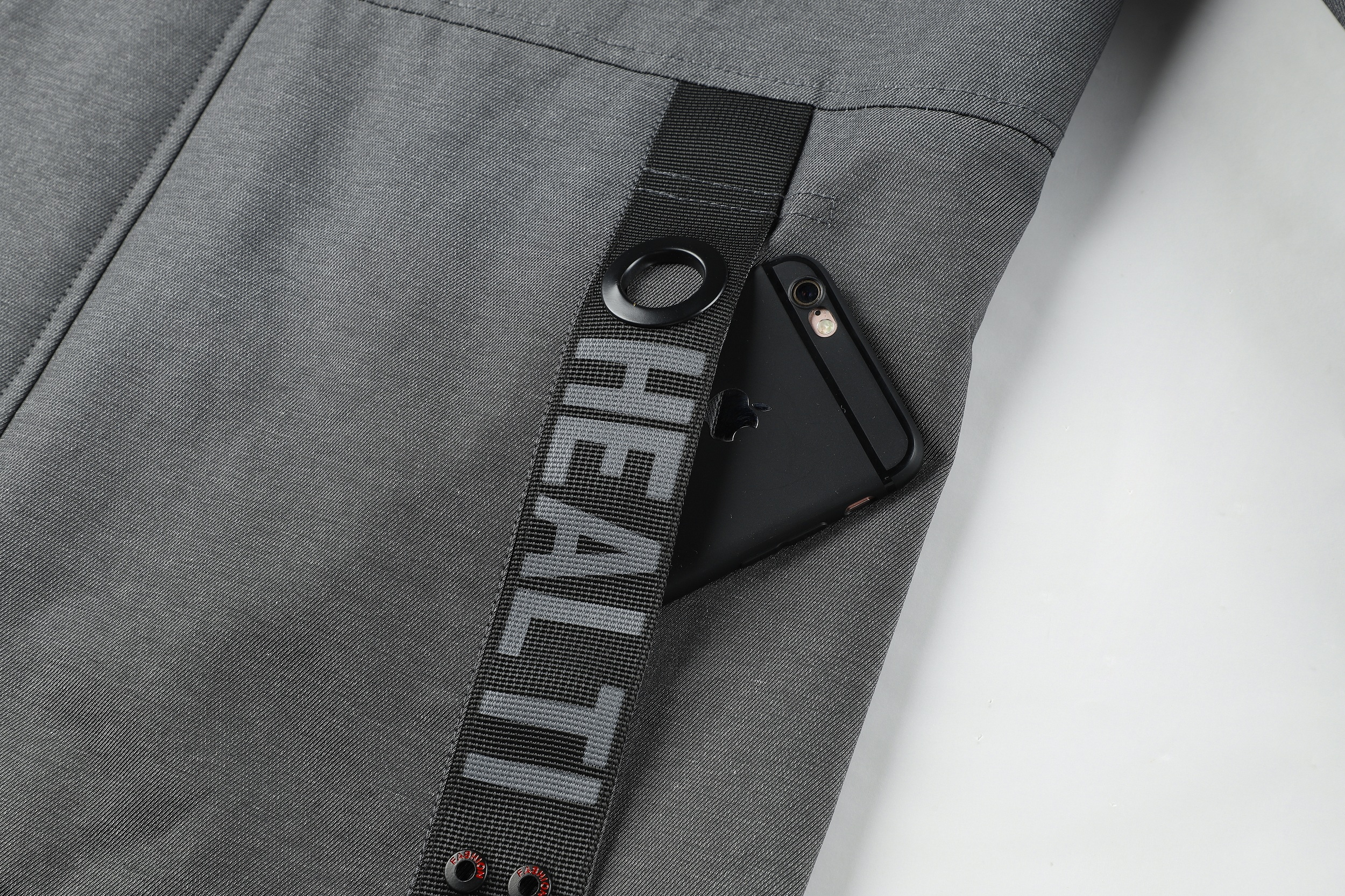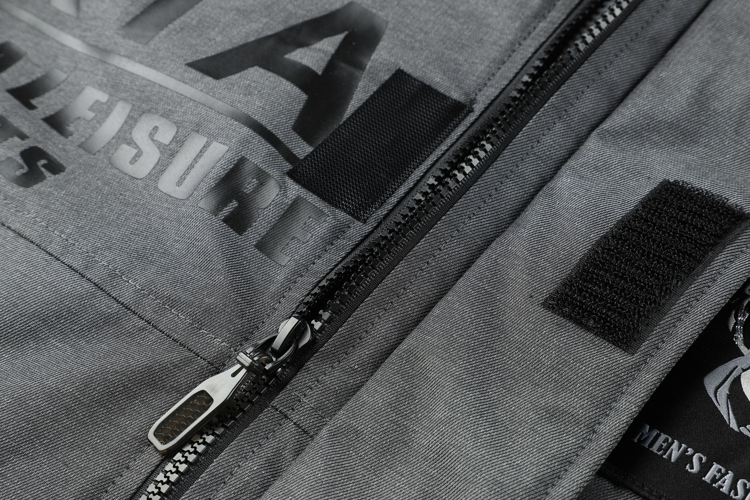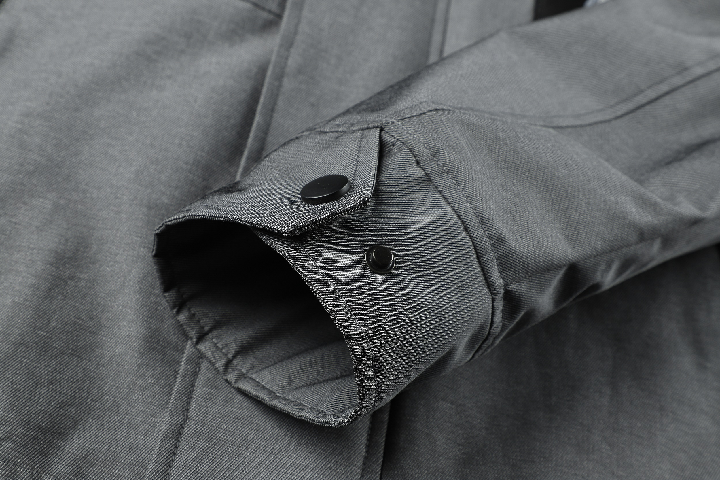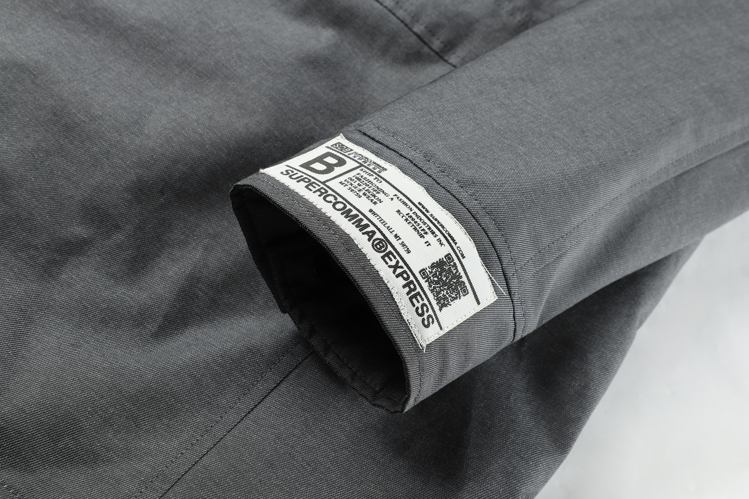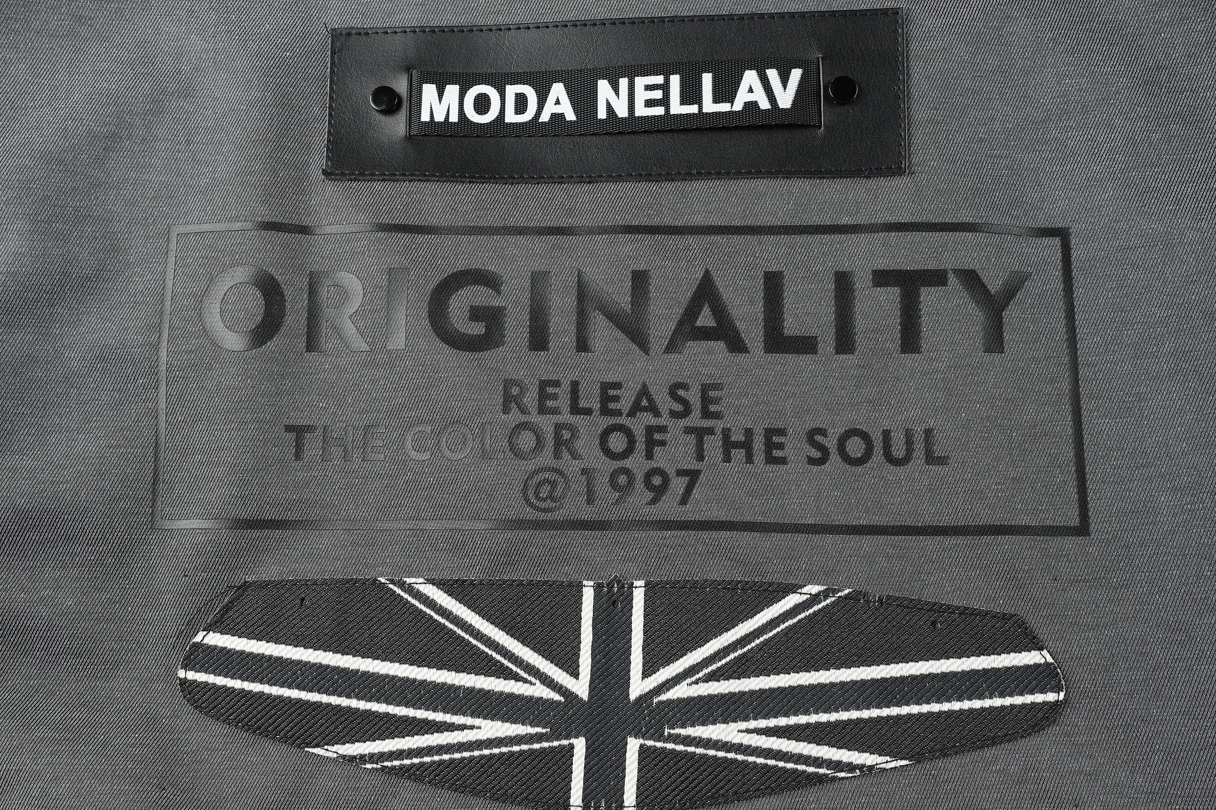 The jacket features a hooded collar, a zippered front, and white trim at the cuffs. There is a badge on the left chest area that appears to have text and a design on it. On the right side of the jacket, there is a small pocket with another badge. The overall design looks modern and stylish.